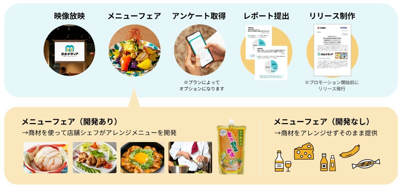 ・ライトプラン:飲食店タイアップメニューの開発や来店客アンケートを行わない小規模な実施を希望する方向け、実施店舗の選定が可能