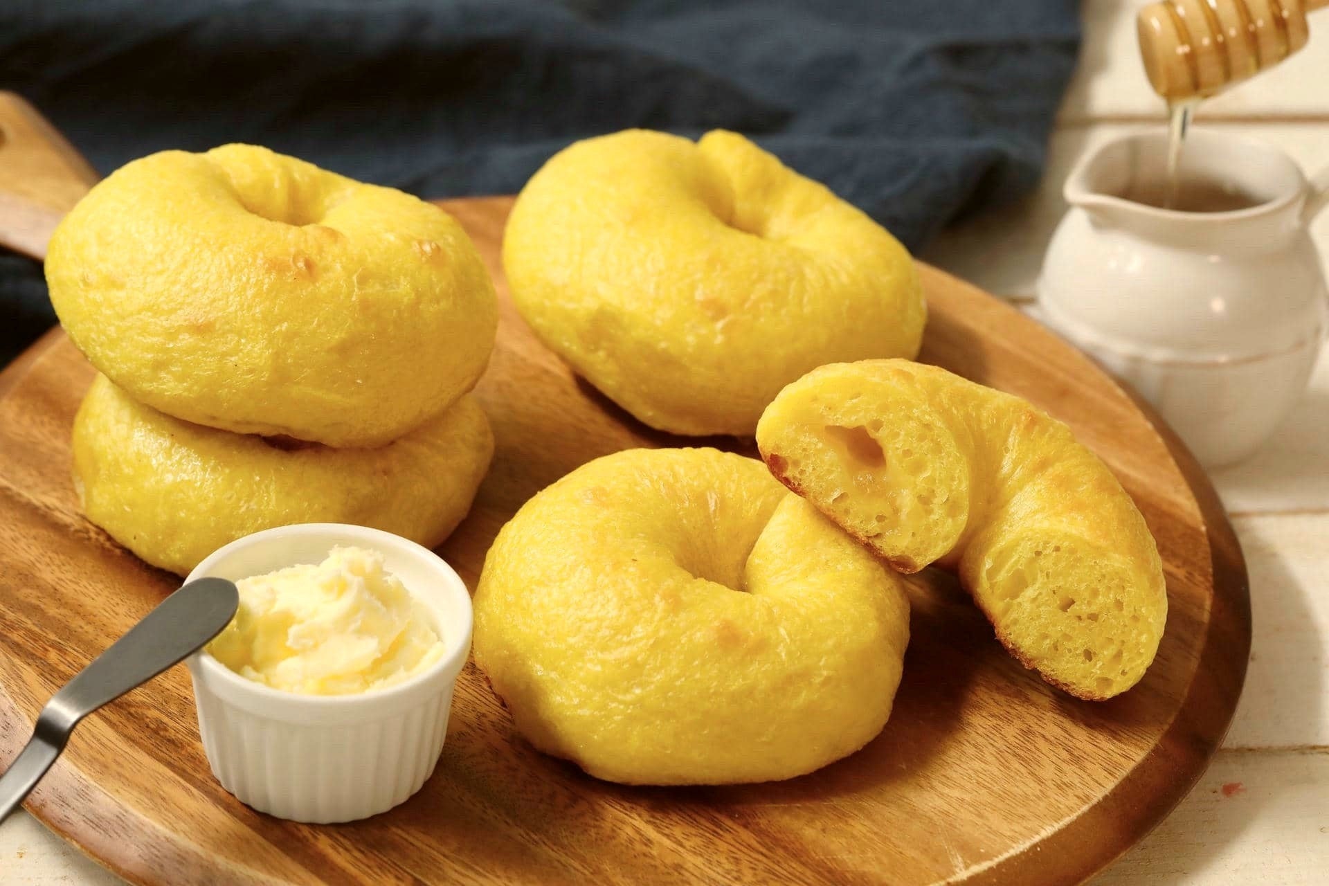 使用したベーグル生地にハニーパウダーを練りこみ、有塩バターとはちみつフィリングを包