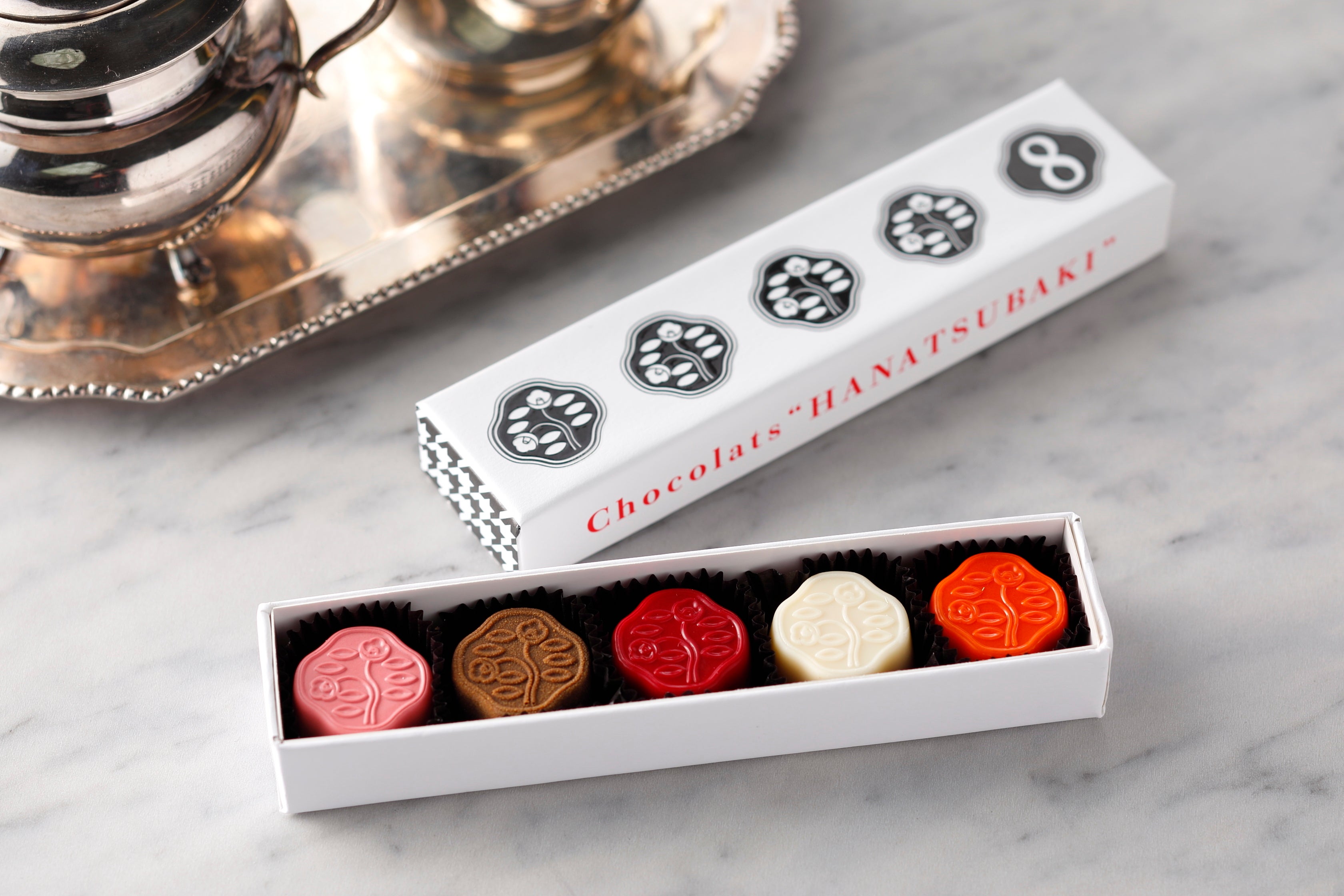 花椿マークをかたどったカラフルなボンボンショコラは、その一粒一粒が個性的です。カフェ、フレーズ、フランボワーズ、マンゴー、スパークリングワインの5種のセットです。