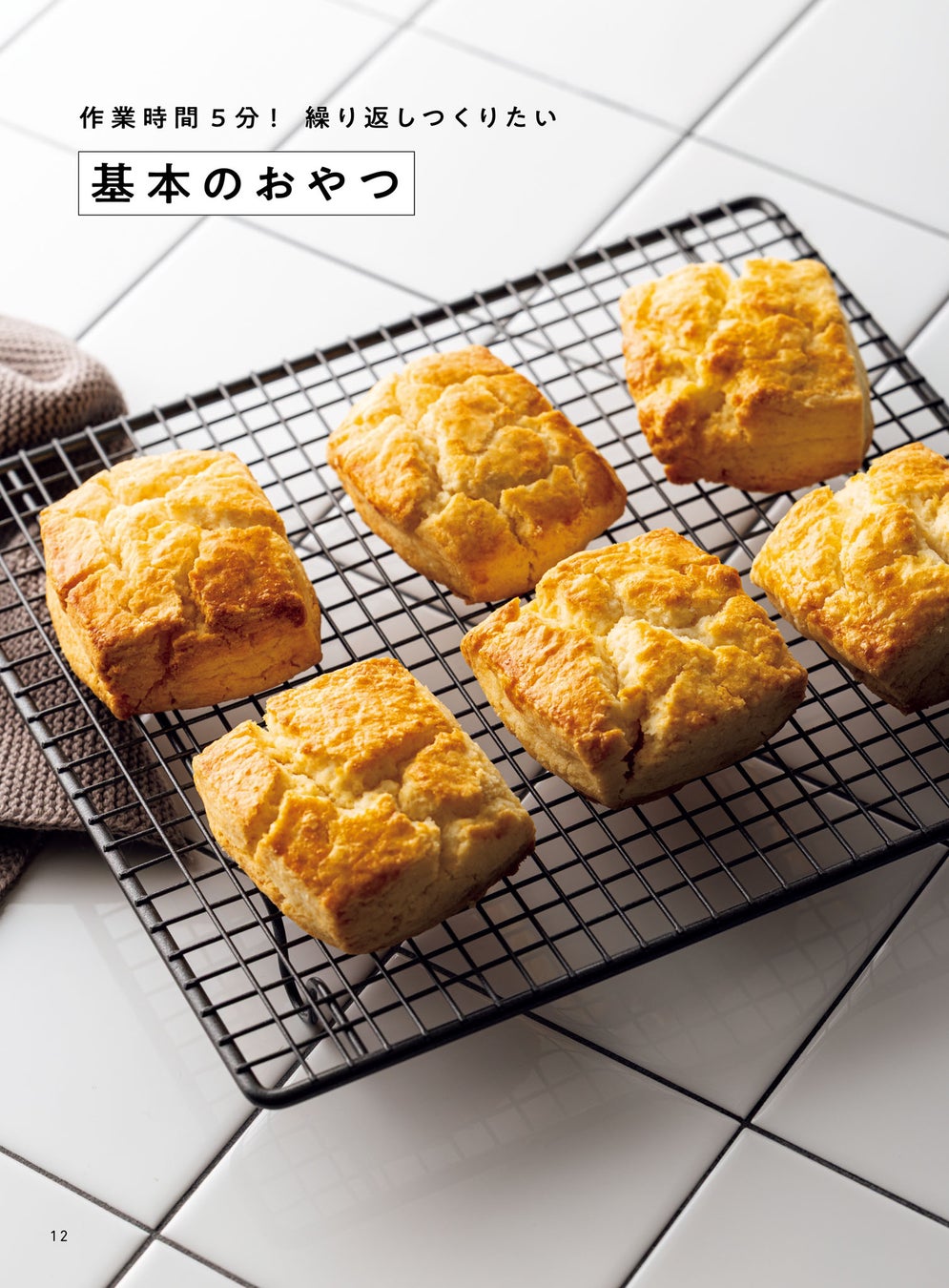 巻頭には、作業時間5分の基本のおやつとして、基本のスコーン、バナナマフィン、グラノーラなどを掲載しています。