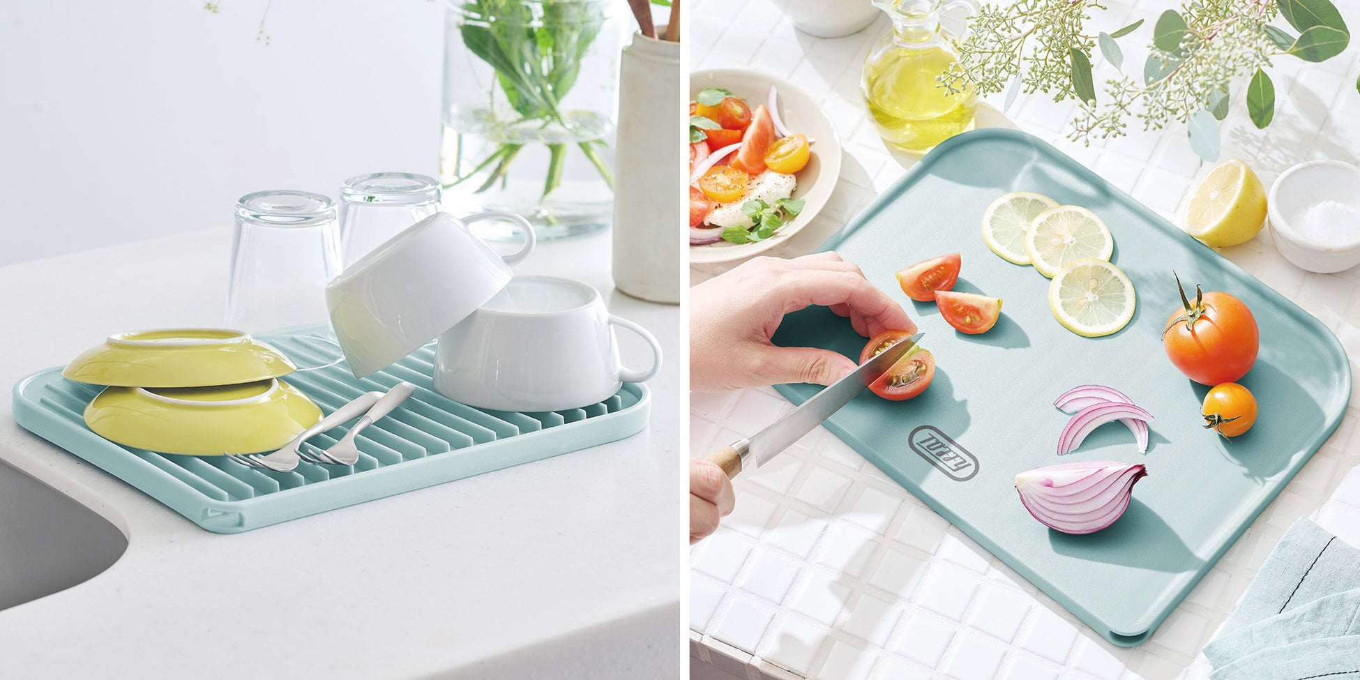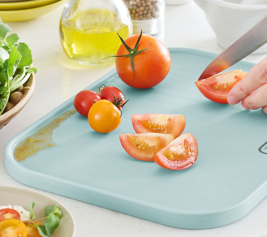 ひっくり返すと便利な水切りトレーとして使える1枚2役のカッティングボード。