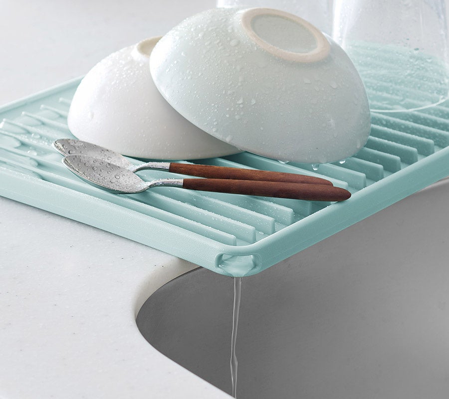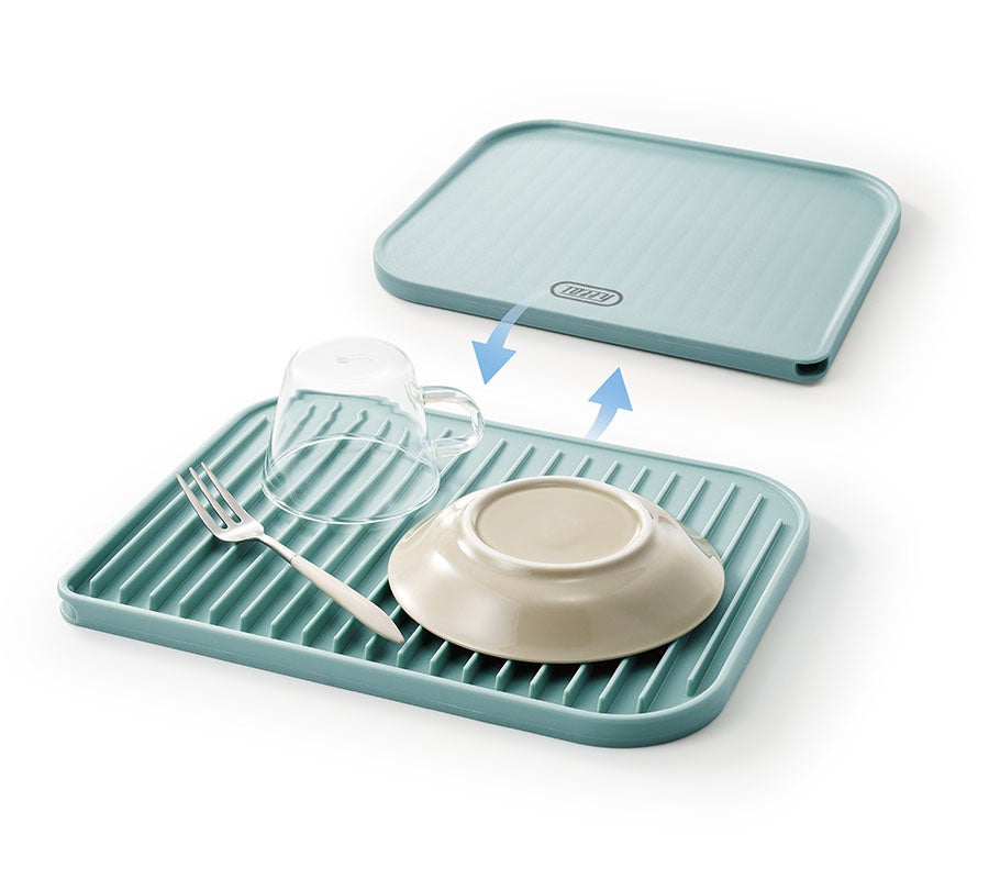 裏返して使える水切りトレー面には、スリットと傾斜構造を採用。洗った食器から落ちた水は水排出穴を通ってシンクへ流れ、水が溜まりにくく、自然乾燥しやすい設計です。