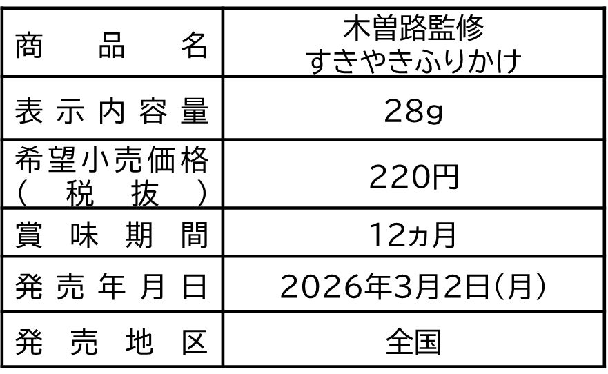 株式会社 永谷園(社長:掛谷 浩志、東京都港区)は、しゃぶしゃぶ・日本料理、和食レストラン、焼肉屋、居酒屋など全国約190店舗を展開する、株式会社木曽路(社長:中川晃成、名古屋市昭和区)とのコラボレーション商品として、「木曽路監修すきやきふりかけ」を2026年3月2日(月)より全国で新発売いたします(希望小売価格:税抜220円)。