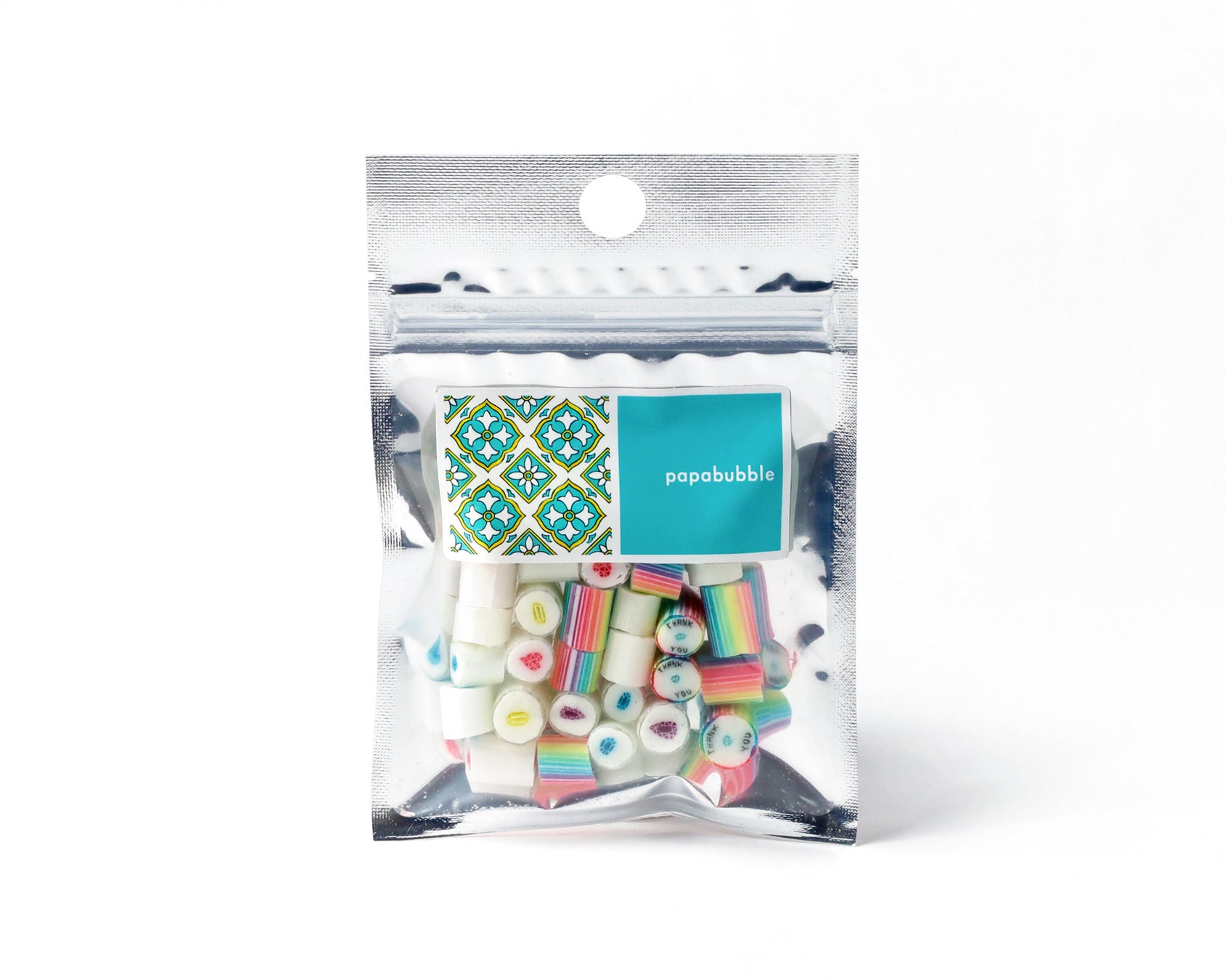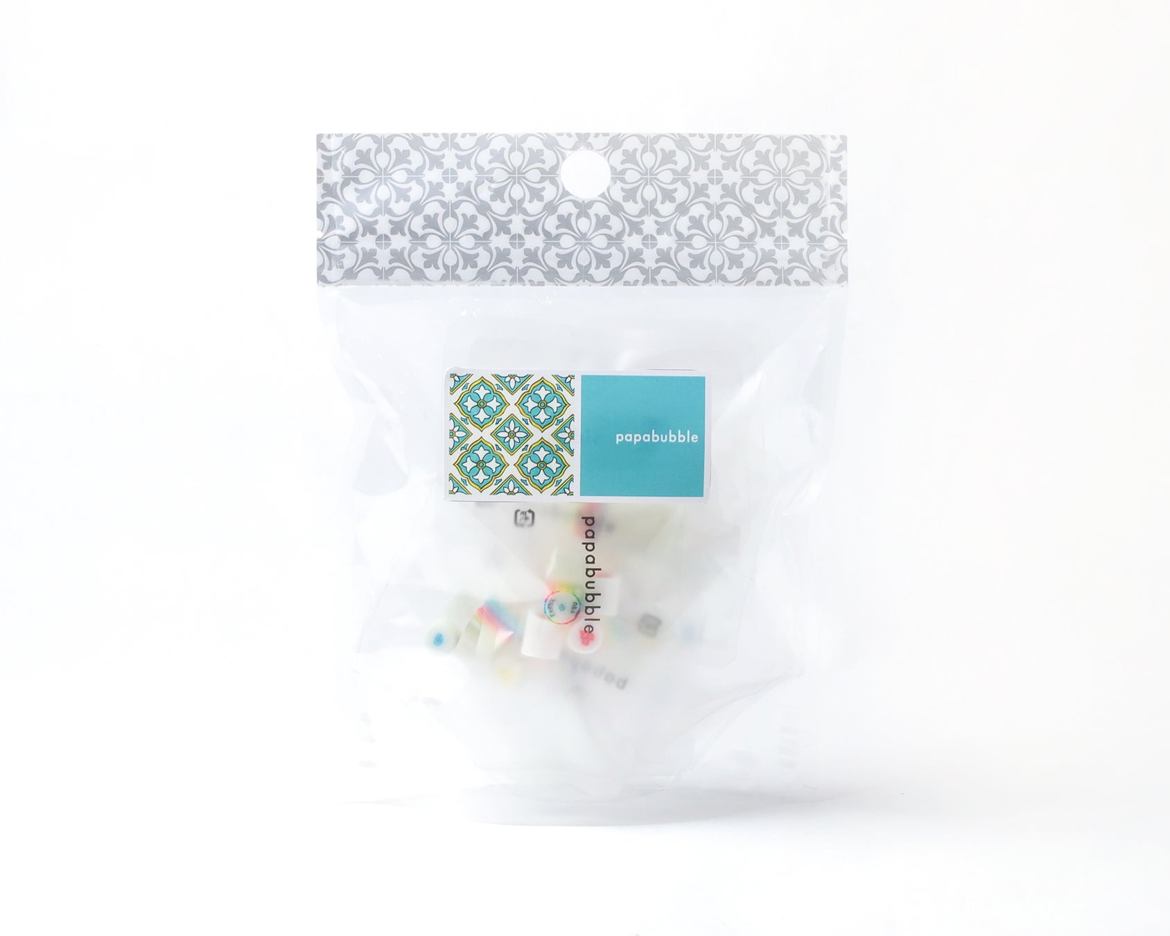 大きめの筒状パッケージのフタにスペインタイル柄を大胆にあしらい、キャンディとバブレッツの両方を詰めた、見た目にも華やかなアソートに仕上げました。