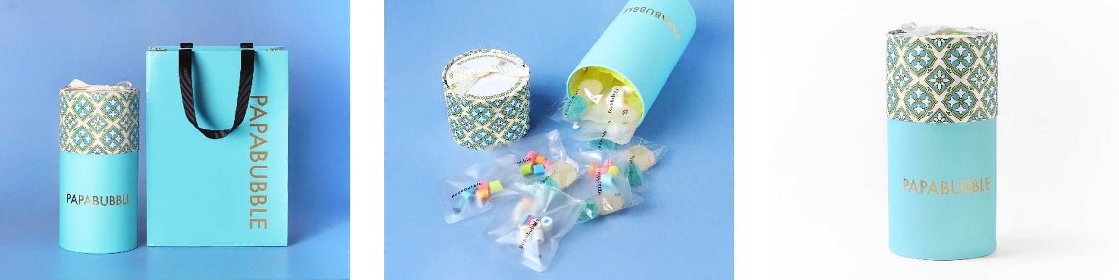 いずれも、水色×白×黄色のスペインタイル柄を採用したパッケージで、清楚で爽やかな印象に。どなたでも手に取りやすい色合いに調整し、年齢や性別を問わず贈りやすいギフトとして仕上げています。