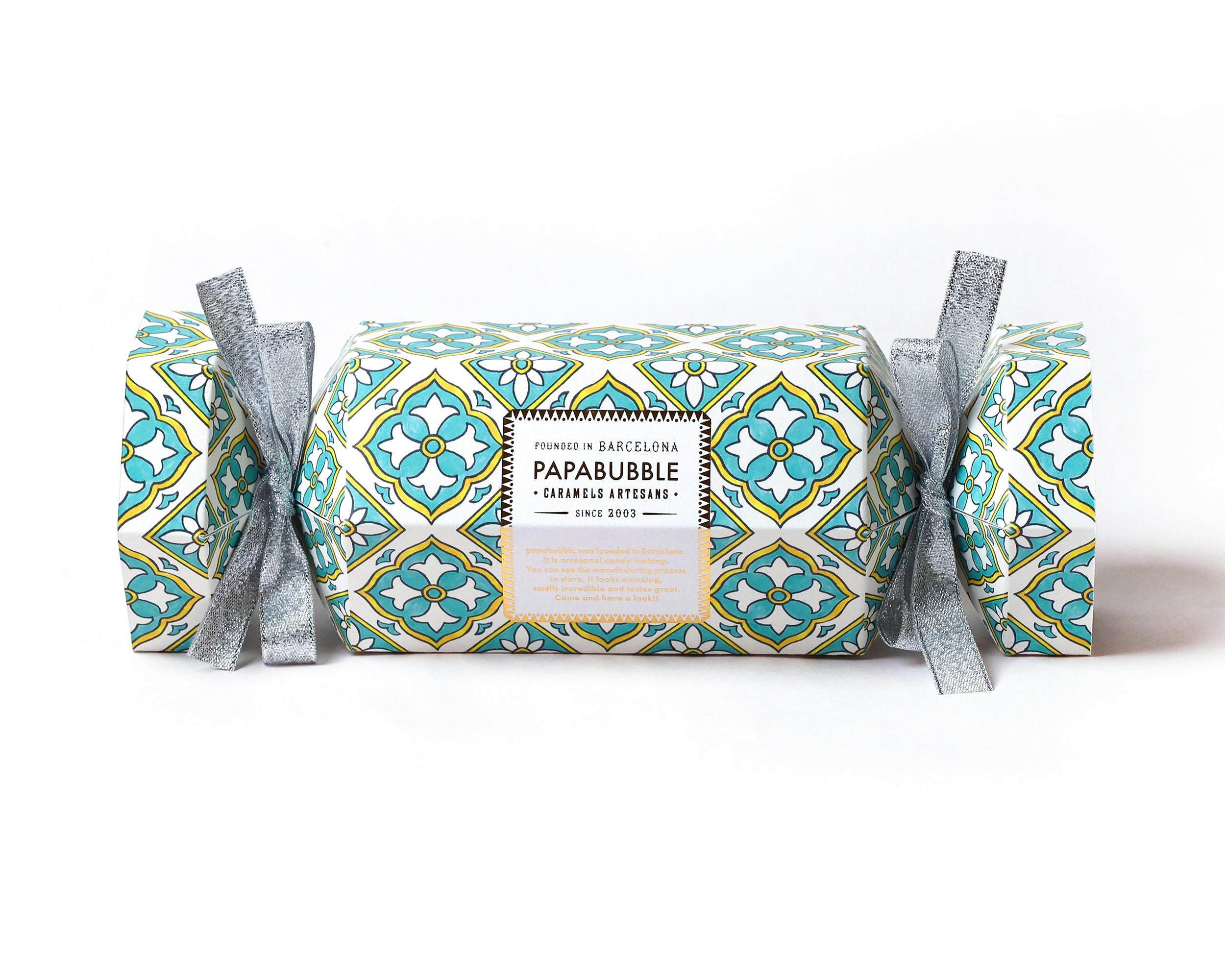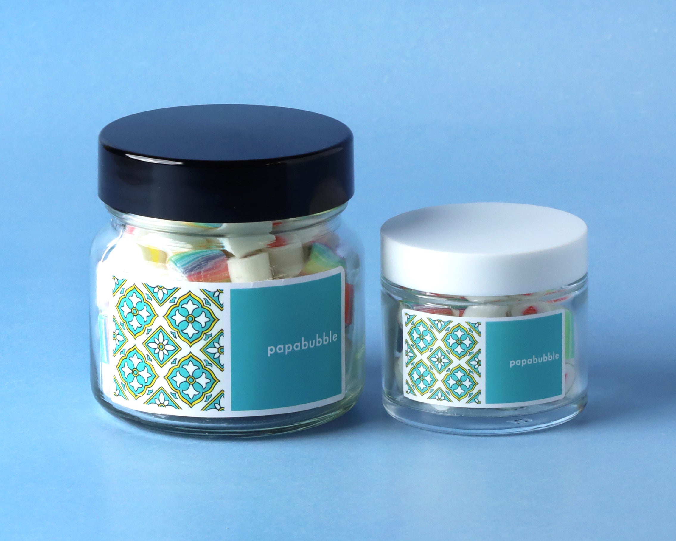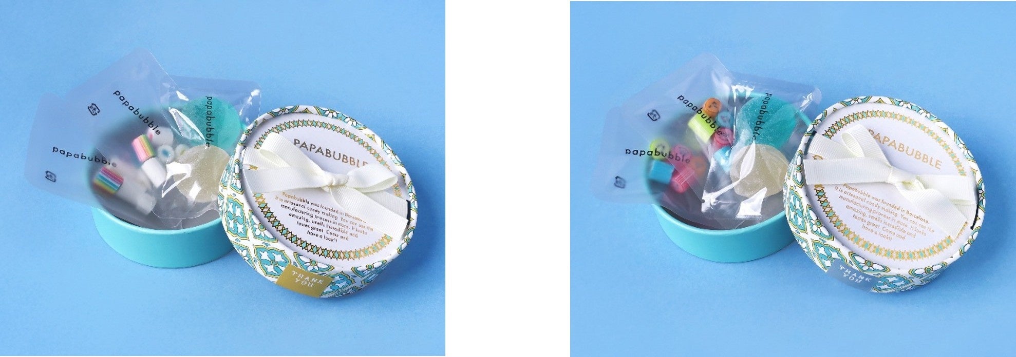 大きめの筒状パッケージのフタにスペインタイル柄を大胆にあしらい、キャンディとバブレッツの両方を詰めた、見た目にも華やかなアソートに仕上げました。