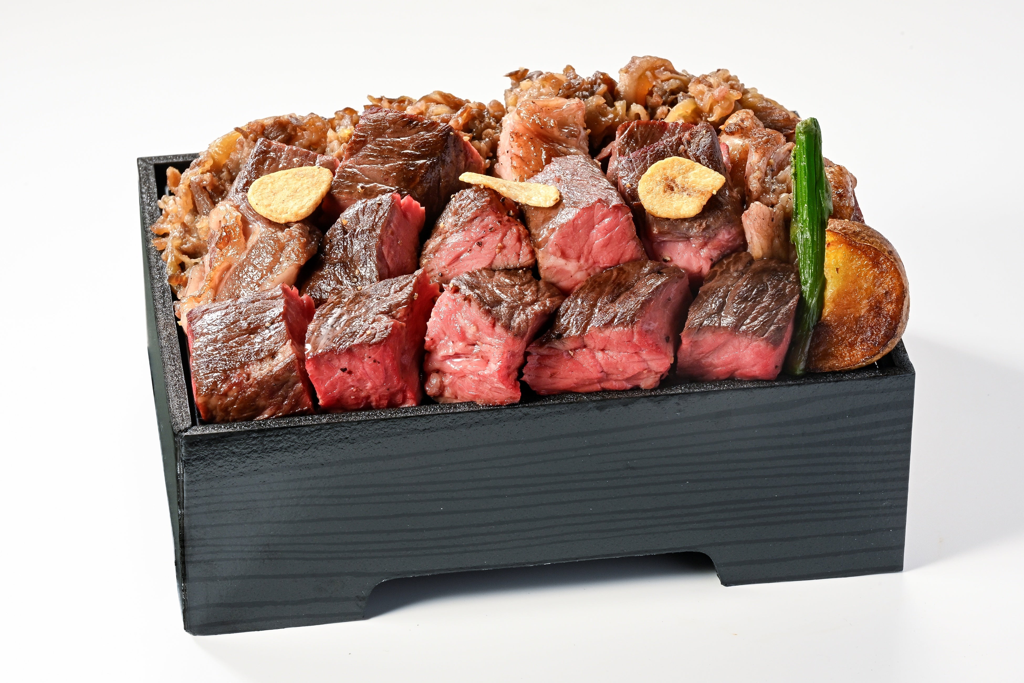 サロマ黒牛モモステーキの赤身の力強さ、サロマ和牛のすき焼きの二種盛り贅沢なメガ盛り弁当。