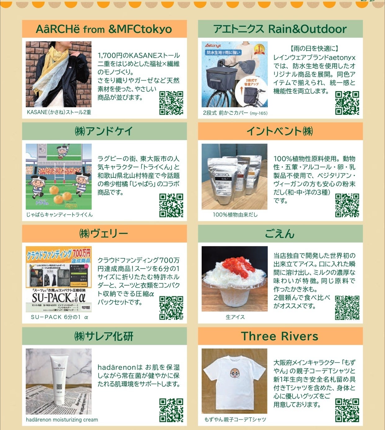 内 容:多種多様な産業が集積する東大阪から16社が出店。老舗のモノづくり企業から、こだわりの衣・食・住関連商品など、さまざまなジャンルから集まり、オリジナルな逸品を一般の消費者にアピールしていただきます。