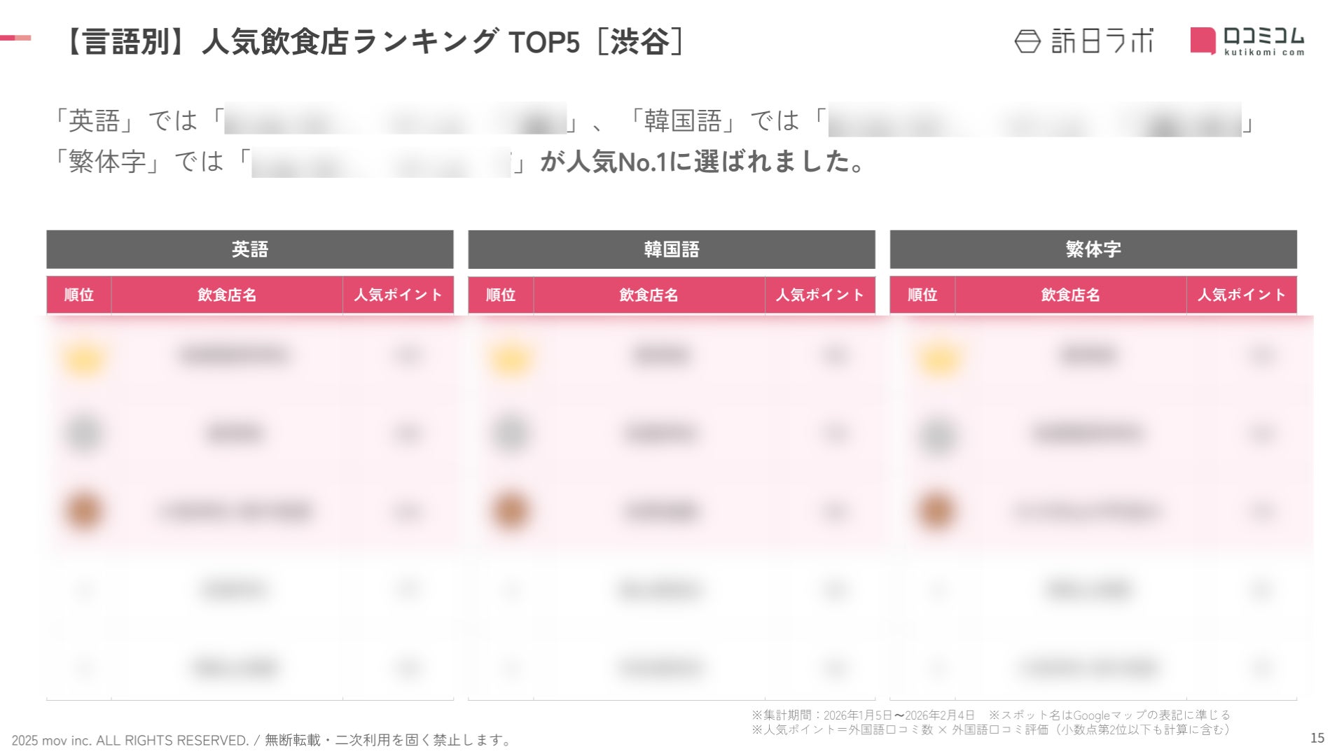 業界最大級のインバウンドビジネスメディア「訪日ラボ」及び 店舗向け集客一元化プラットフォーム「口コミコム」を運営する株式会社mov(代表取締役:渡邊 誠、本社:東京都渋谷区、以下mov)は、渋谷の飲食店に寄せられた最新の口コミデータから、独自の『インバウンド人気飲食店ランキング』を発表しました。