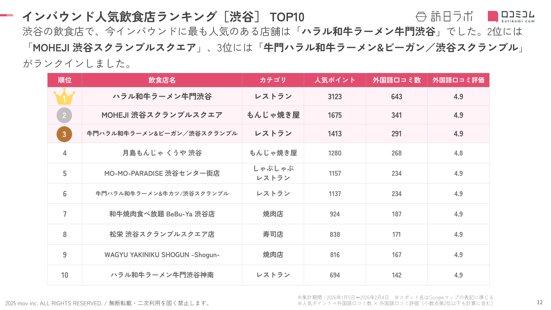 業界最大級のインバウンドビジネスメディア「訪日ラボ」及び 店舗向け集客一元化プラットフォーム「口コミコム」を運営する株式会社mov(代表取締役:渡邊 誠、本社:東京都渋谷区、以下mov)は、渋谷の飲食店に寄せられた最新の口コミデータから、独自の『インバウンド人気飲食店ランキング』を発表しました。