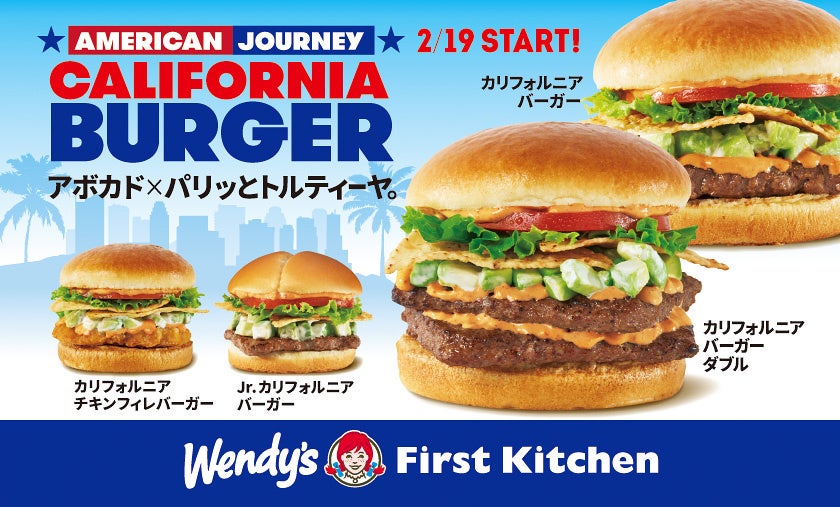 ウェンディーズ·ジャパン株式会社及び、ファーストキッチン株式会社 (所在地:東京都新宿区、代表取締役:紫関修) では、2月19日(木)から、ウェンディーズ· ファーストキッチン全店にて、本格的なバーガーが楽しめる「アメリカンジャーニー※」の第4弾として「カリフォルニアバーガー」など、4種の新商品を発売します。カリフォルニアが発祥ともいわれる“コブサラダ”をイメージして選定したアボカドマヨネーズやコブマヨソースが、ビーフパティやチキンフィレ肉の旨みをより引き立てます。そして、今年は食感のアクセントとして、アメリカの定番「タコサラダ」に使用されているトルティーヤチップスを加えてパワーアップさせました。