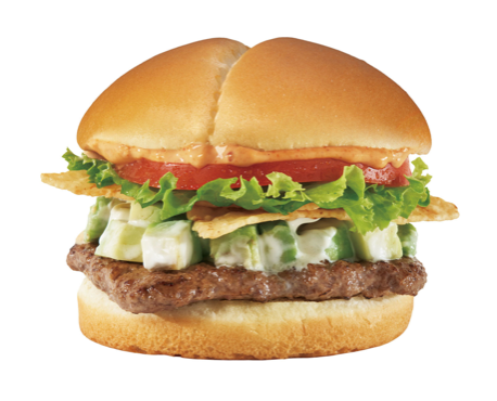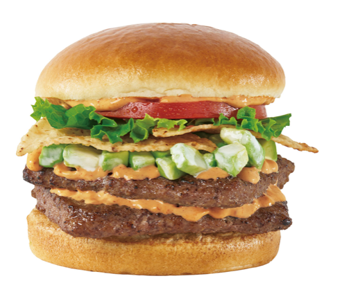 ウェンディーズオリジナルのジューシーなビーフ100%パティを2枚使用したボリューミーな商品。「コブサラダ」をイメージして、アボカドマヨとコブマヨソース、パリッと食感が楽しめるトルティーヤチップスを組み合わせました。見た目にもインパクトたっぷりな春限定バーガーです。