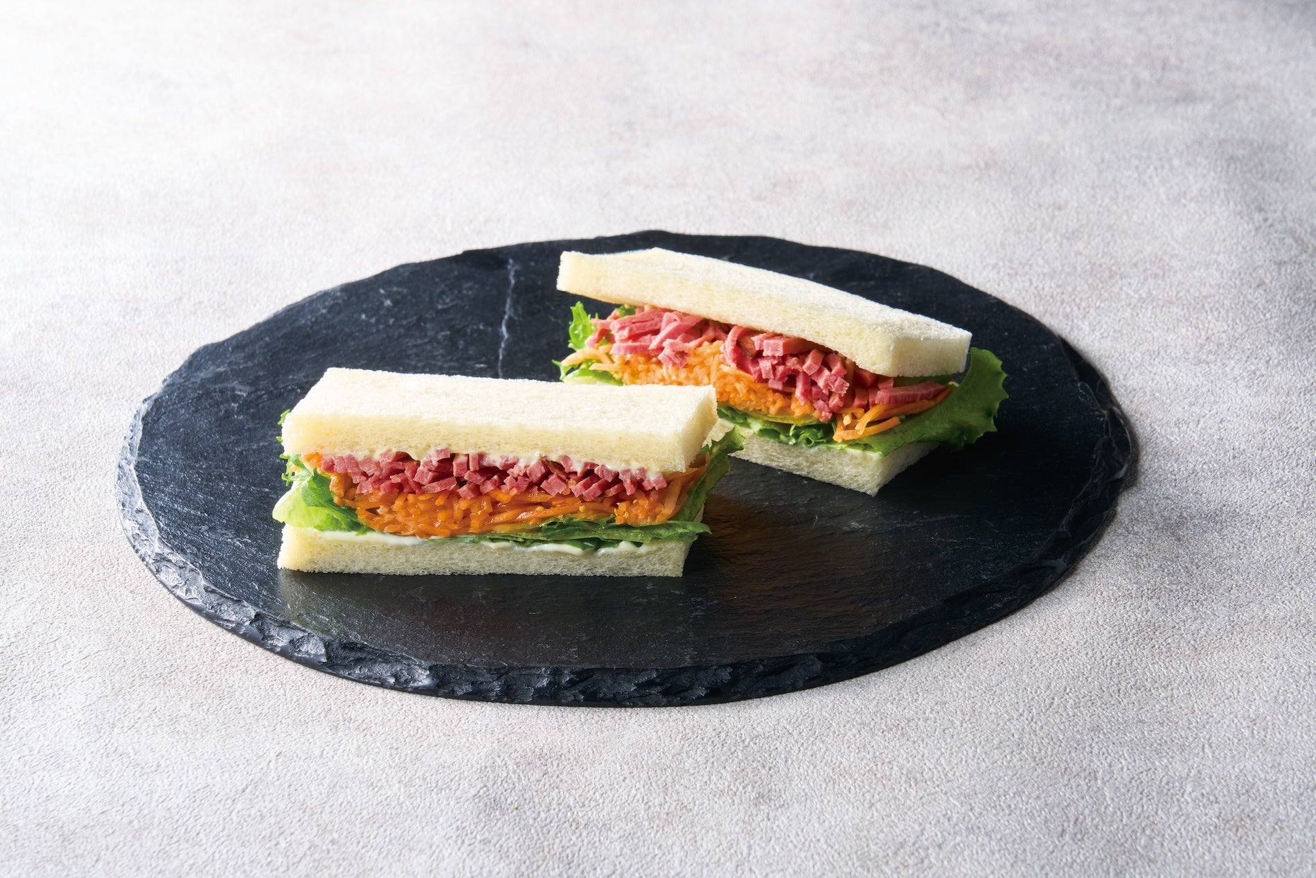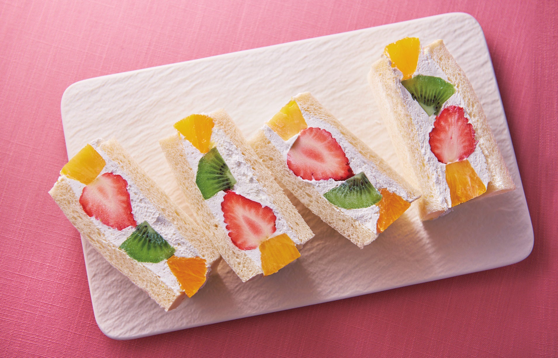 毎朝お店で焼き上げるサンドイッチに使用する食パンは、国産小麦の湯ごね生地を使うことで、しっとりとした食感にし、フルーツサンドに合わせ、甘さは控えめに仕上げています。店内ではお好みのサンドイッチを二切れずつ「ハーフ&ハーフ」でお選びいただけます。「フルーツミックスサンド」と「名物 かにサラダサンド」など、ご自由に組み合わせてお楽しみください。