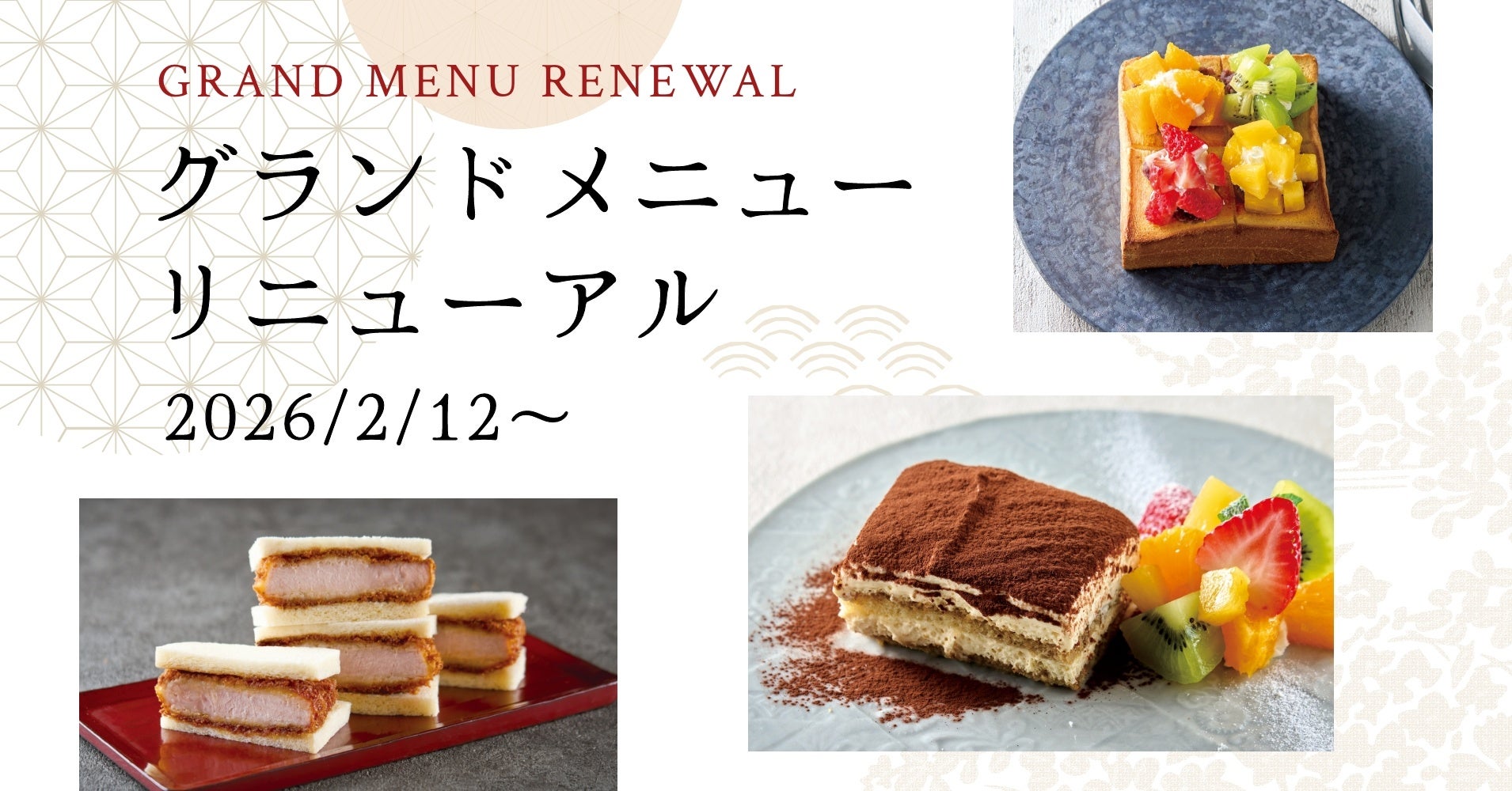 リニューアル後のメニューでは、シェアにおすすめの「フレッシュ野菜とパストラミのサラダ」や、食べ応えのある厚切りジューシーなご馳走サンド「厚切りロースかつ」、お店で仕込む「自家製ティラミス 季節のフルーツ添え」など、お食事メニューからデザートまで新商品をお楽しみいただけます。