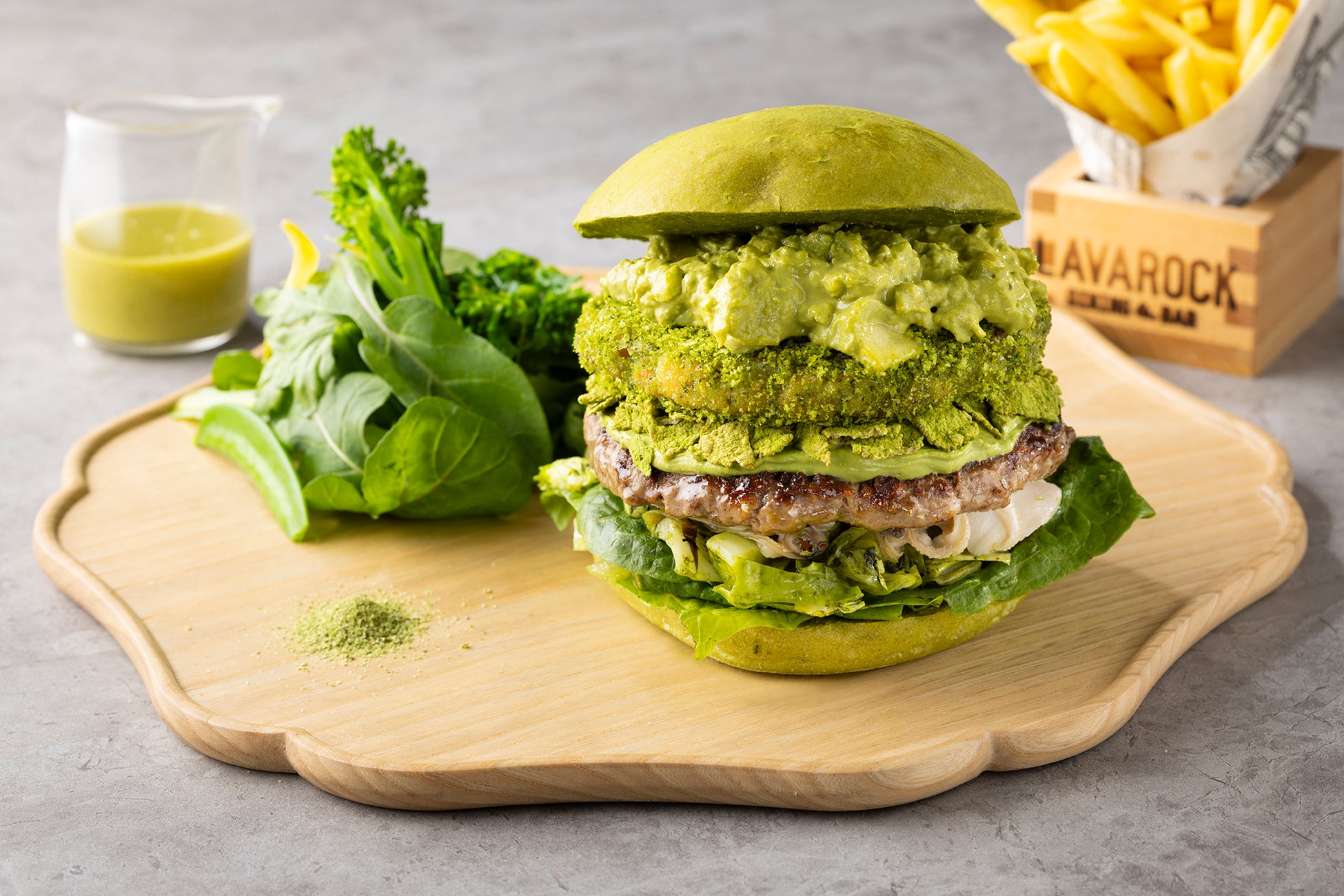 抹茶を練り込んだバンズに、ロメインレタス、抹茶を入れて炒めた春キャベツとはまぐりのソテーを敷き、国産牛100%のビーフパティ、その上に抹茶入りのクリームチーズやクランブルを重ね、香草でマリネしたサクラマスの抹茶フライ、最後に抹茶のタルタルソースをのせました。ビーフパティの旨みにサクラマスの風味が重なり合い、肉のコクと魚の旨みに、抹茶の苦みや風味をお楽しみいただけます。サイドにご用意した抹茶塩は、野菜サラダやフレンチフライのアクセントとして、またハンバーガーに少しかけるなど、お好みでご堪能ください。