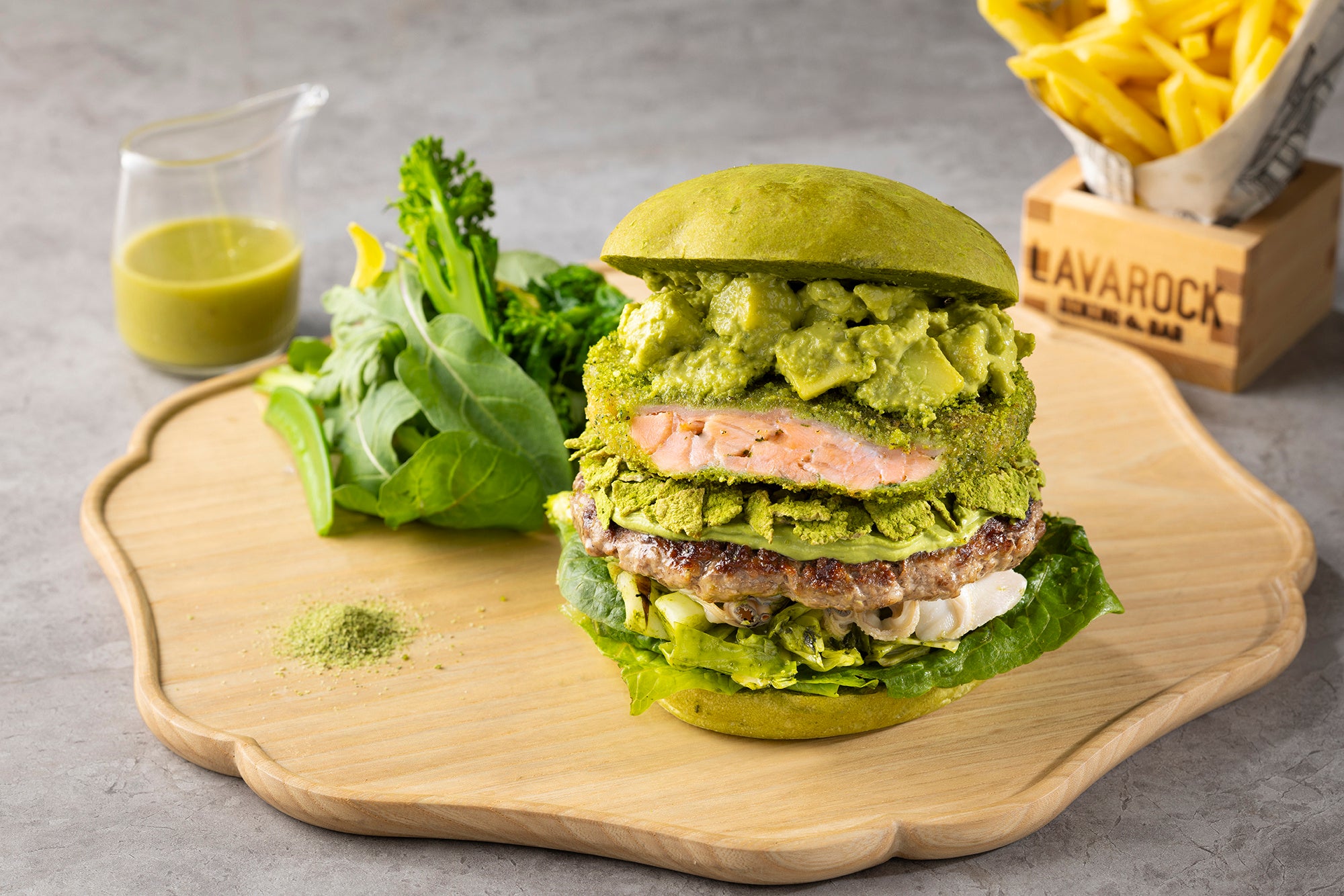 抹茶を練り込んだバンズに、ロメインレタス、抹茶を入れて炒めた春キャベツとはまぐりのソテーを敷き、国産牛100%のビーフパティ、その上に抹茶入りのクリームチーズやクランブルを重ね、香草でマリネしたサクラマスの抹茶フライ、最後に抹茶のタルタルソースをのせました。ビーフパティの旨みにサクラマスの風味が重なり合い、肉のコクと魚の旨みに、抹茶の苦みや風味をお楽しみいただけます。サイドにご用意した抹茶塩は、野菜サラダやフレンチフライのアクセントとして、またハンバーガーに少しかけるなど、お好みでご堪能ください。