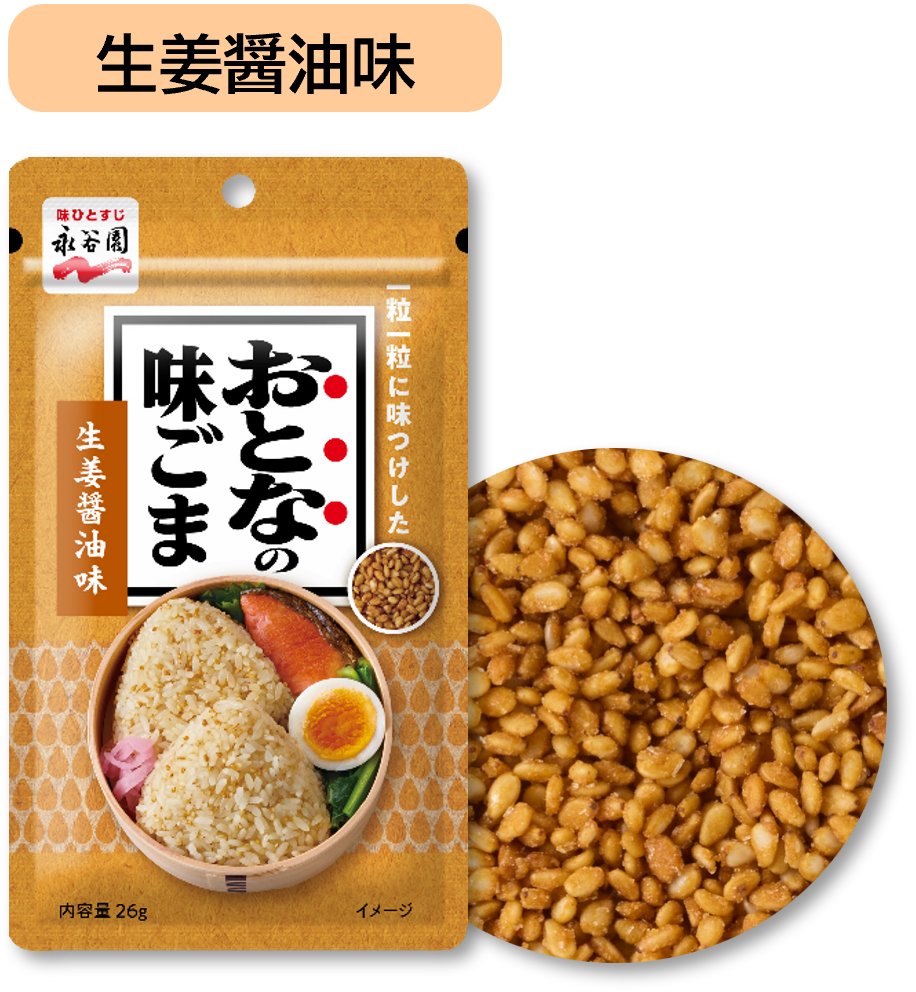 爽やかな生姜の風味に、たまり醤油を使用したコクも感じられる味わいに仕上げました。生姜の風味を立たせるために、焙煎が弱めのごまを使用しています。