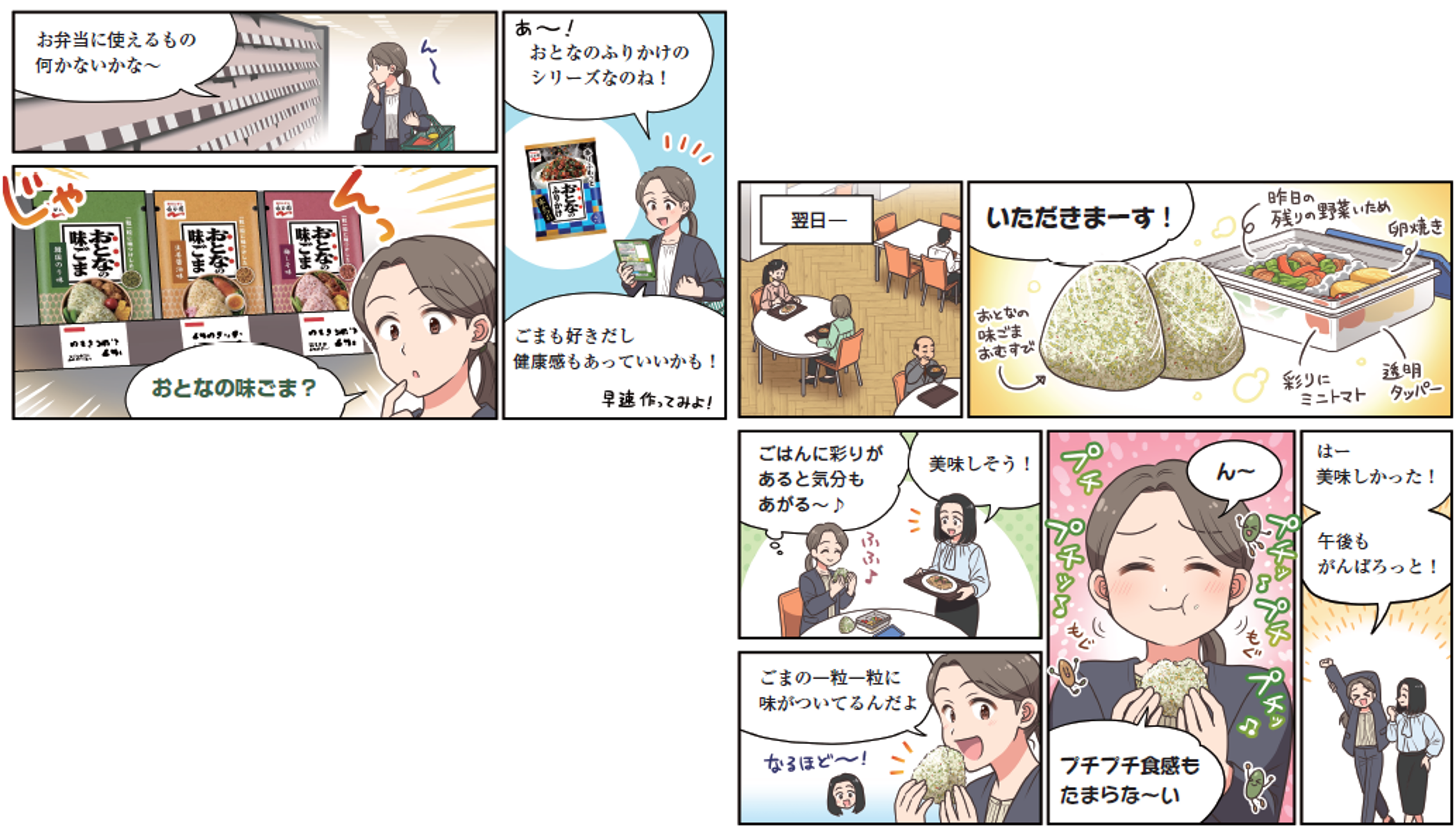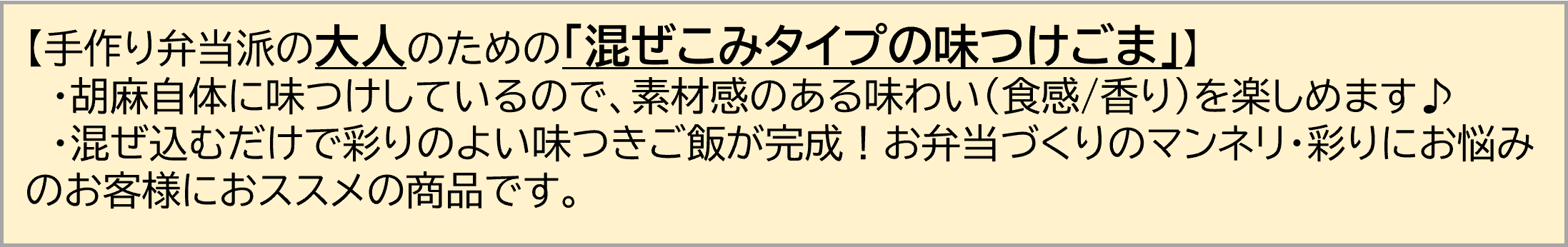 おとなの味ごまがあれば、いつものお弁当の満足度がちょっとアガる♪」そんな存在になればと考え、本品を開発いたしました。