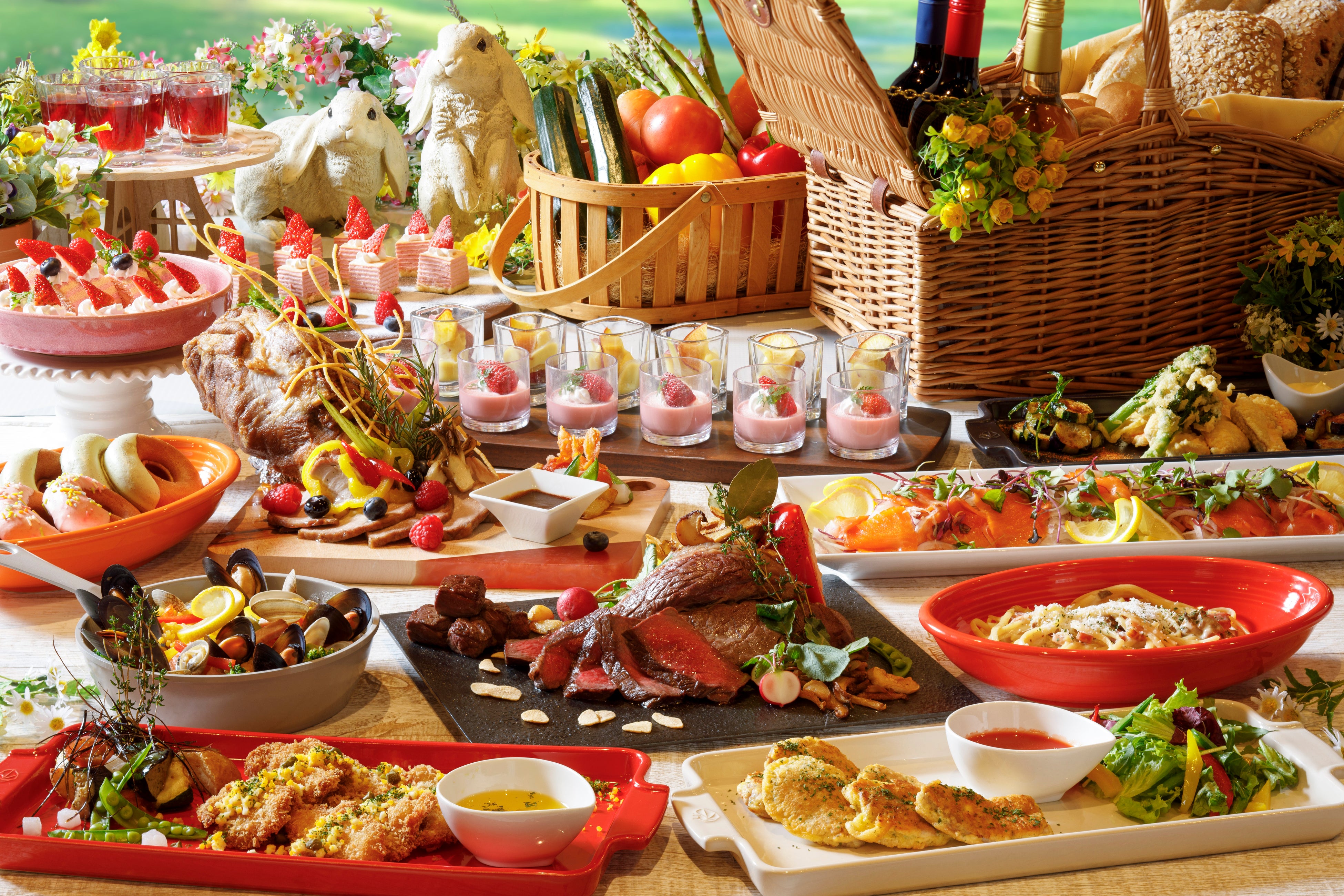 国産牛肉の鉄板焼き / ローストポークベリー入りヴァンルージュソース / サーモンと菜の花のフリットアイオリソース / 白身魚のソテー実山椒ソース / ポルチーニ入りきのこのクリームパスタ / あさりと青のりのパスタ / サーモンとグリル野菜のトマトソースパスタ / オムライスデミグラスソース / ひとくちチキンカツ ノワゼットバターソース / ミックスパエリア / 彩りベジブッフェ / カポナータ / エスカベッシュ / あたたかいスイートポテト / いちごムース / いちごミルクレープ / いちごロールケーキ / いちごまるごとゼリー 等