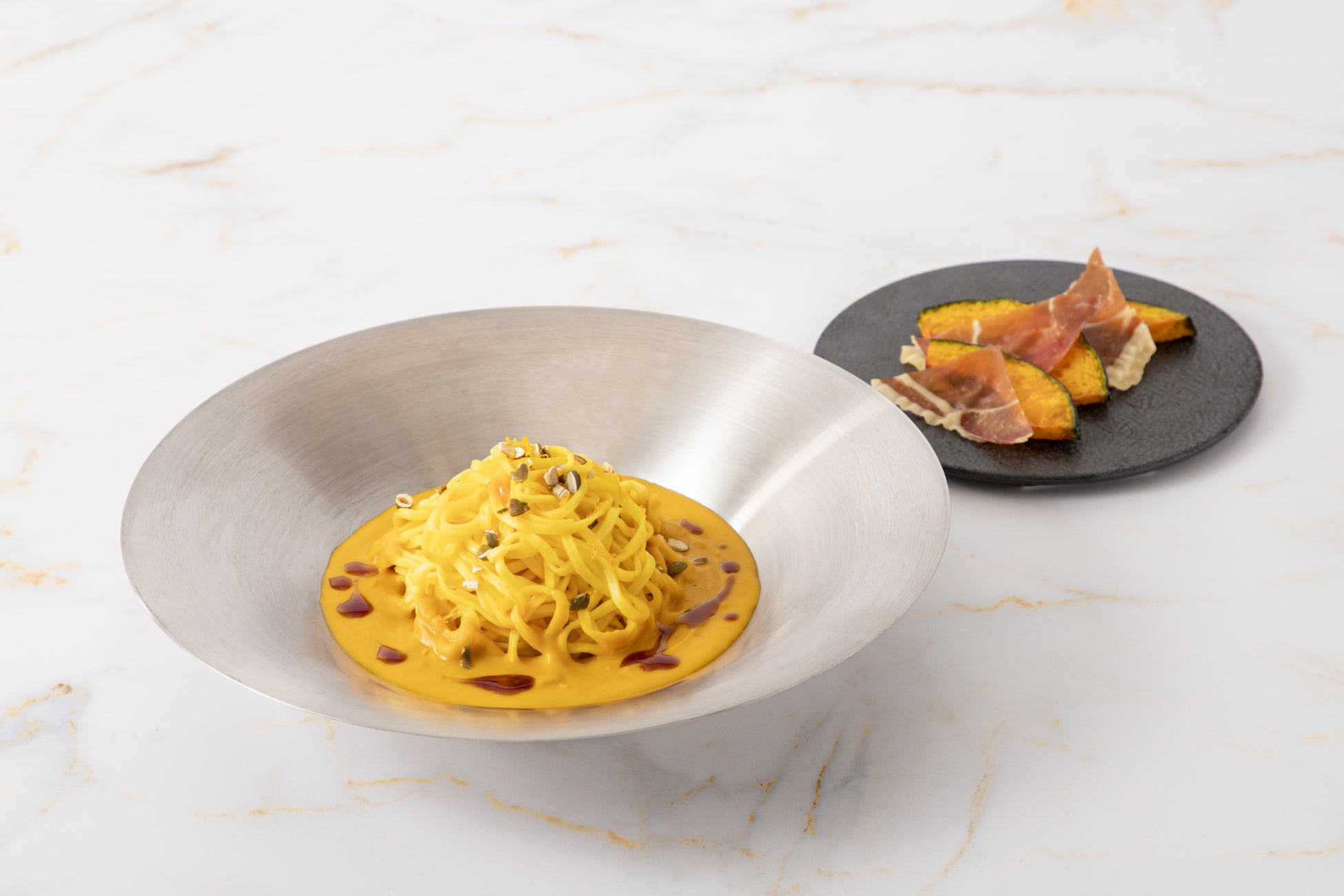 黄金色のかぼちゃクリームにチキンブイヨンとカマンベールのコクを重ね、もっちりとしたタリオリーニを合わせた一皿です。