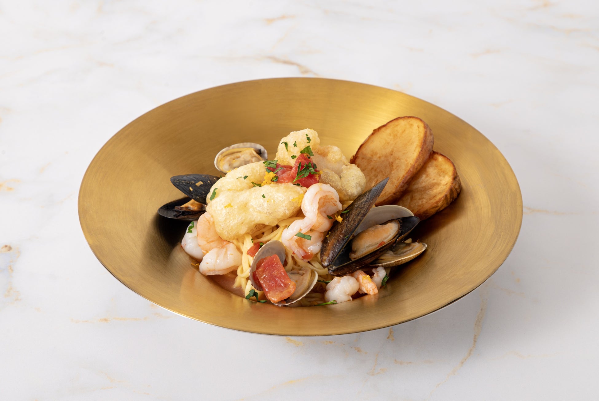 えびやムール貝、あさりなどの魚介に、貝出汁とトマトを合わせ、タリオリーニを用いたアクアパッツァ風の一皿に仕上げました。