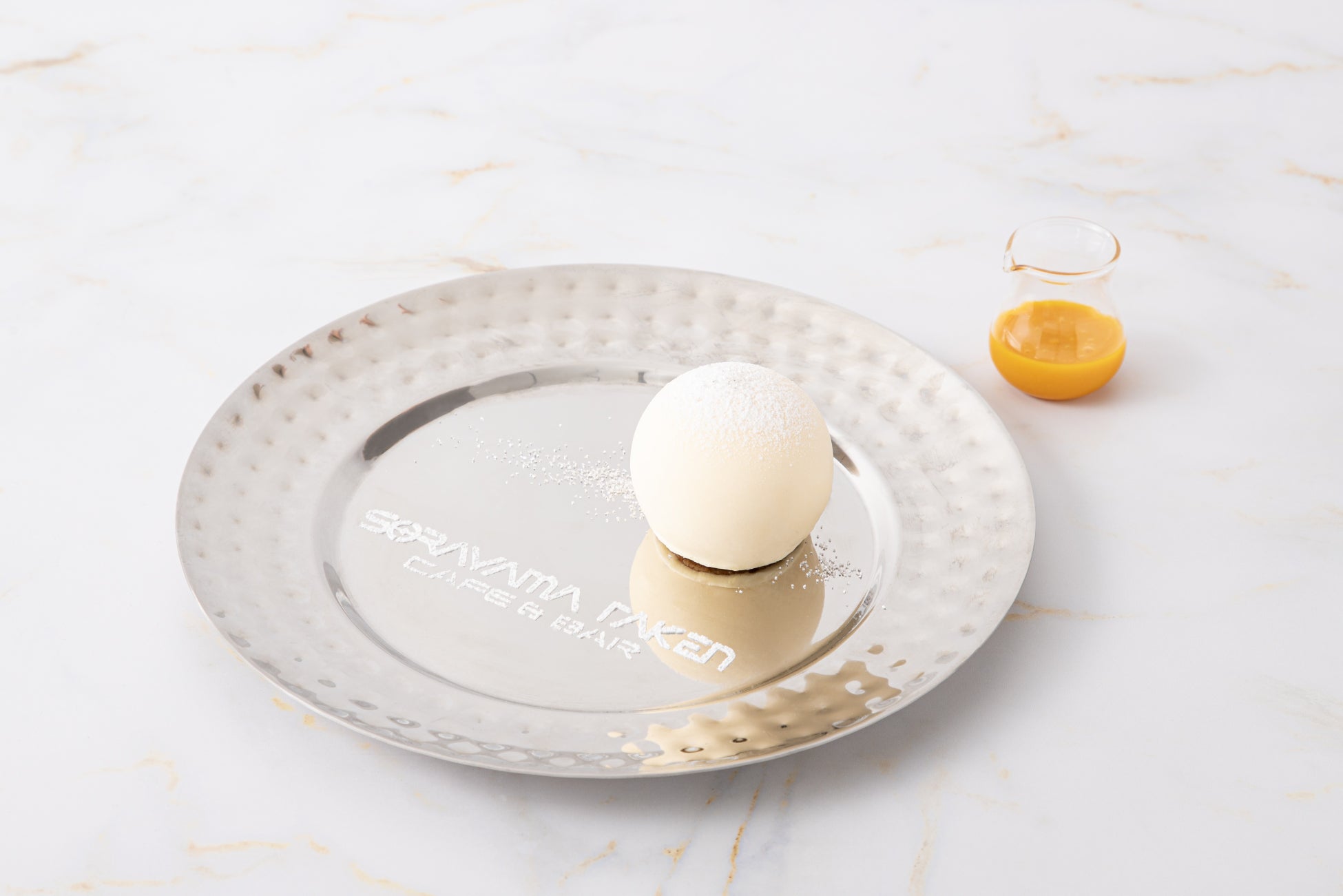 球体に仕上げたチーズムースにライチジュレを組み合わせた、軽やかな味わいの一皿です。