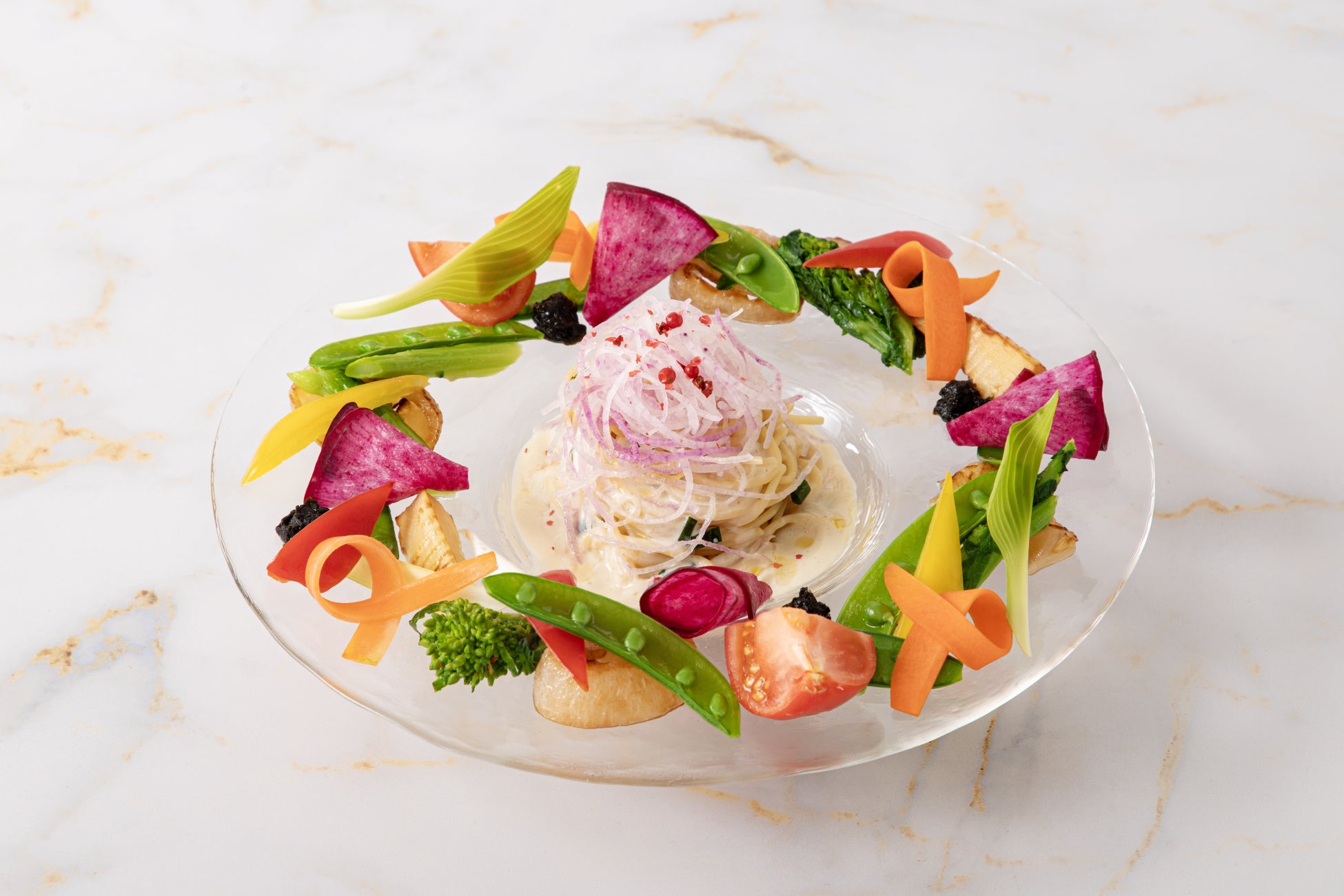 透明な器に彩られた春の旬野菜が、涼やかで奥行きのある味わいを引き立てます。