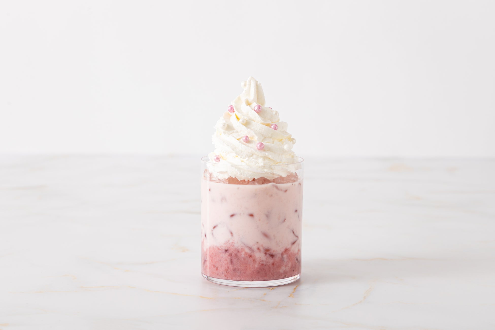 特別展示室「ピンクティールーム」をイメージしたストロベリーミルク。やさしい甘さでデザート感覚の一杯。