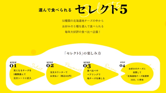 会場では、北海道ならではの気候風土により育まれた個性豊かな北海道地チーズを製造する工房・メーカー約50社が直接販売。味わいやすいおすすめの食べ方など、生産者に直接聞きながら購入することができる他、お好みのチーズ5種を選んで食べ比べできる看板企画「セレクト5」や、ここでしか味わえない限定コラボスイーツ、北海道産ワインや日本酒とのペアリングなど、北海道地チーズの奥深い世界を体験いただけるコンテンツを多数ご用意しております。