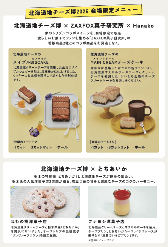 愛らしいお菓子でファンを集める「ZAXFOX菓子研究所」の看板商品2商品とのコラボスイーツが登場。北海道産クリームチーズやマスカルポーネを贅沢に使用した「メイプルBISCAKE」や「MAIN CREAMチーズケーキ」を会場限定で提供します。