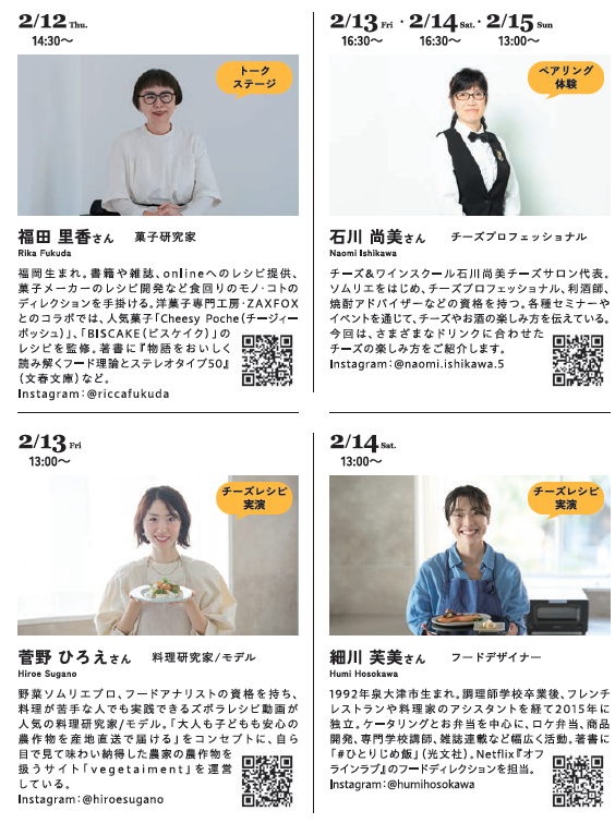 期間中は、菓子研究家・福田里香さん、チーズプロフェッショナル・石川尚美さん、料理研究家・菅野ひろえさん、フードデザイナー・細川芙美さんによる、トークショーやペアリング体験講座も連日開催します。