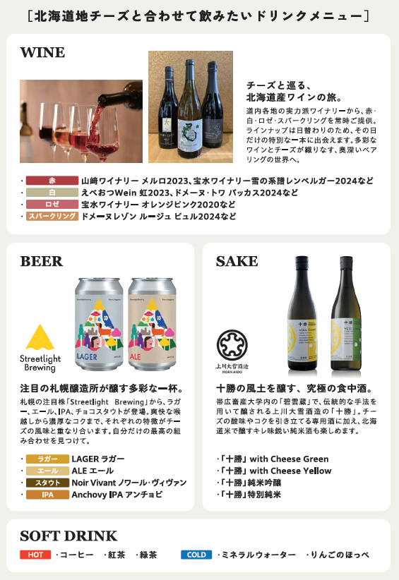 北海道地チーズの味わいを引き立てるドリンクも充実。