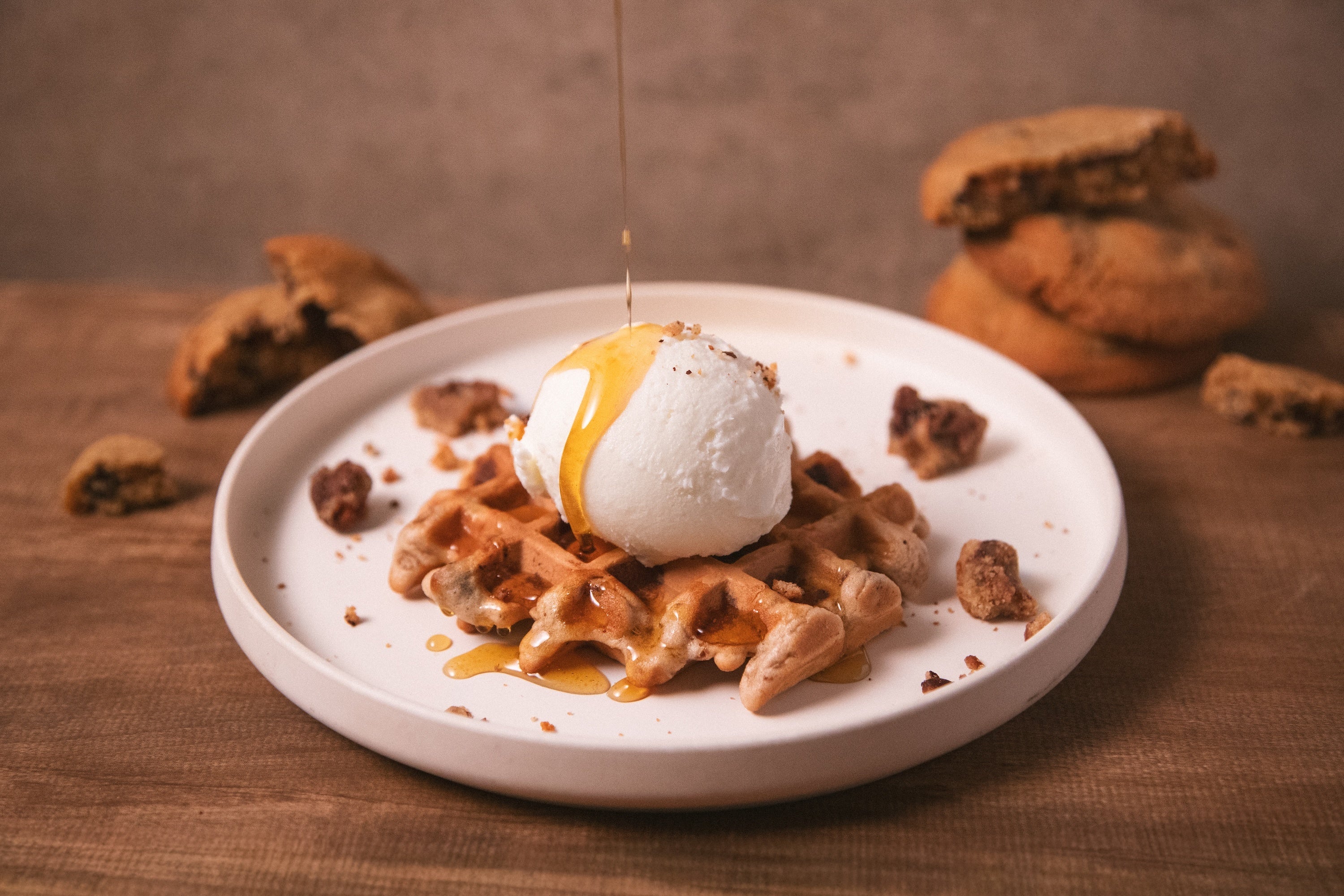 刻んだボストンクッキーをワッフル生地に練り込み、店内で焼き上げました。食べ進めるごとに、クッキーの食感と香ばしい風味が口に広がります。ふんわりと香るシナモンと、メープルシロップとミルクアイスが合わさり、甘いけれど軽やかで、最後まで心地よく楽しめる一品です。