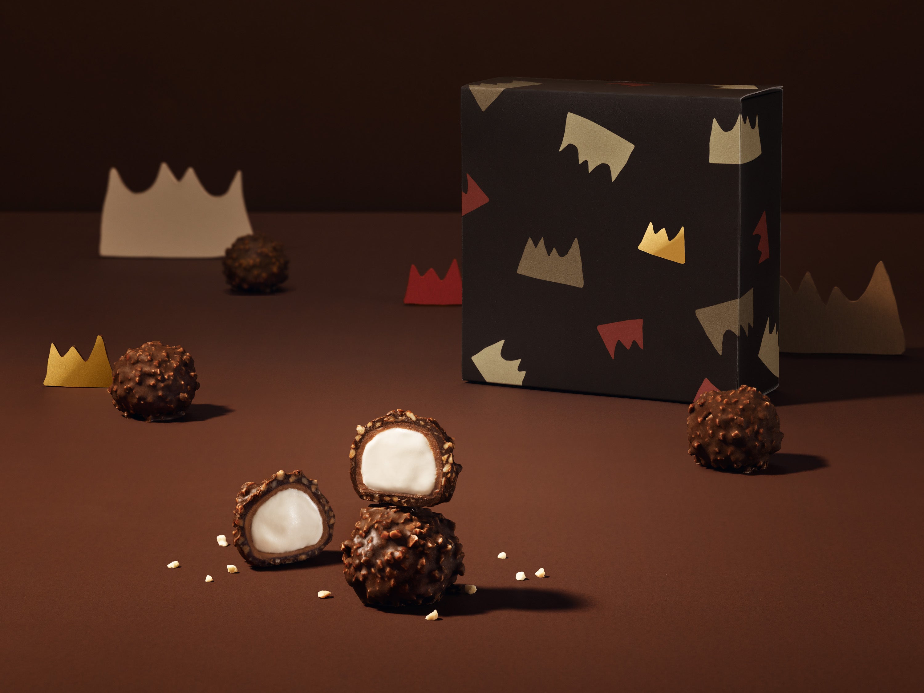 冬の放牧牛乳を加えた生クリームを生チョコレートで包んだ、まろやかな生トリュフチョコレートに、ザクザクとした食感のビターなアーモンドチョコレートを纏わせました。“パリッ・フワッ・トロッ”のトリプル食感を楽しめる、新登場の生トリュフアーモンドチョコレートです。