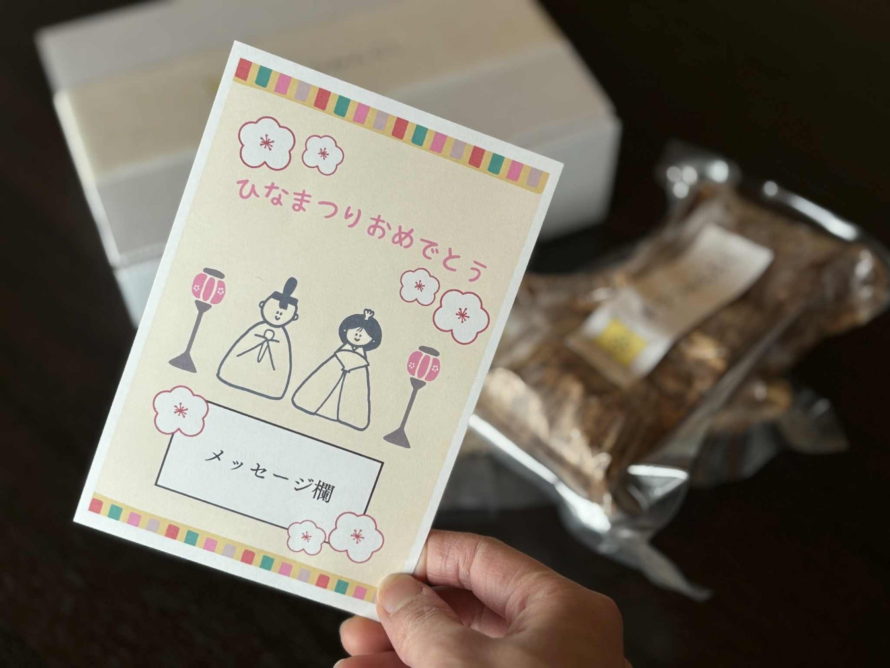 本商品は通常の焼印の代わりに「おめでとう」の文字をあしらうことで、お祝いに適した見た目であるだけでなく、玉子と椎茸、6種類の具材が縁起の良い食材である点も、ハレの日にぴったりの一品です。化粧箱入り・ひな祭りメッセージカード付きで、ひな祭りのお取り寄せや贈り物、手土産としてふさわしい仕立てでお届けします。