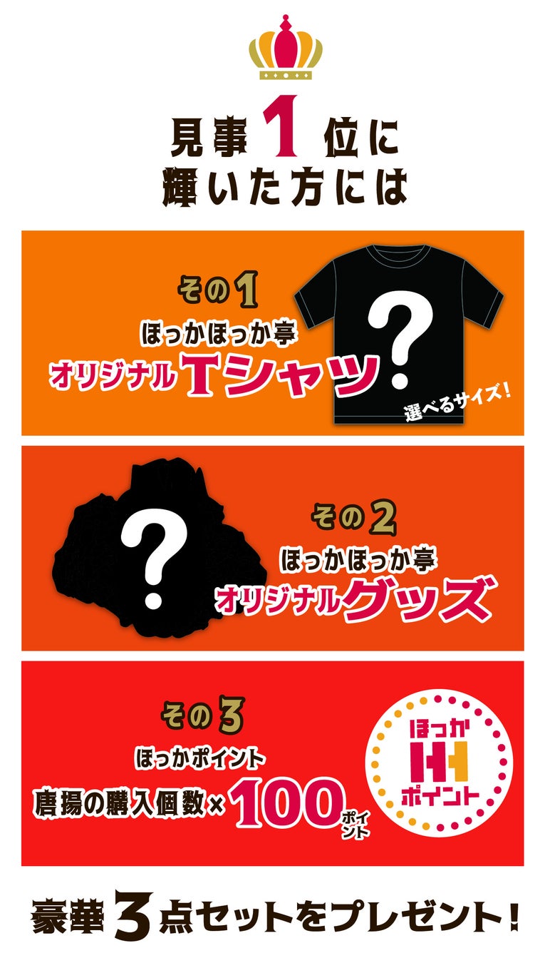 公式アプリ「ほっかアプリ」より、モバイルオーダー(オンライン決済)で、ご購入いただいた対象商品に入っている唐揚の個数をランキング形式で競う「唐揚チャンピオン決定戦」を開催!参加賞として、購入数量に応じて「ほっかポイント」をプレゼント!また、見事1位に輝いた方には豪華景品も!唐揚チャンピオンを目指す、あなたの挑戦をお待ちしています!