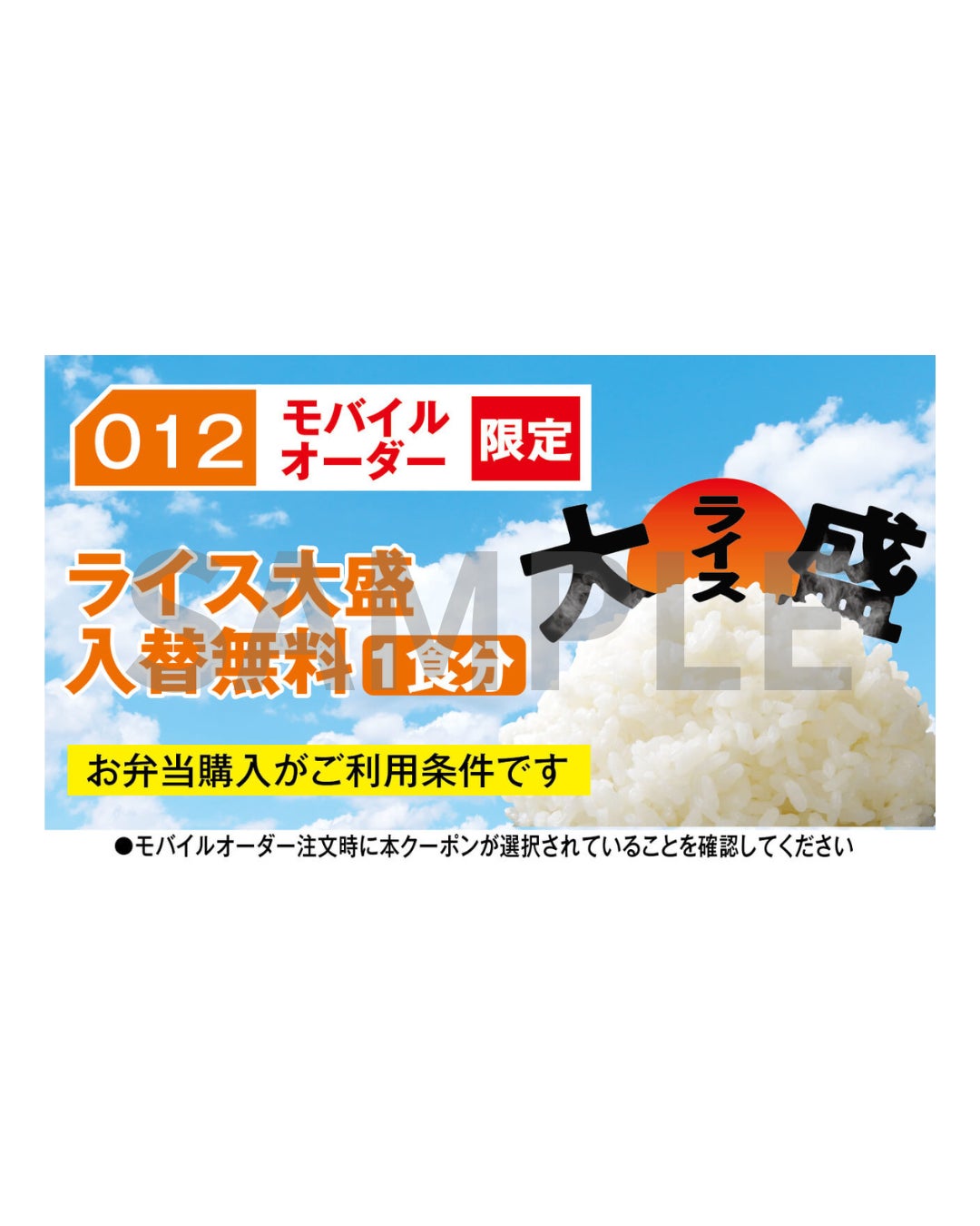 ・内容:モバイルオーダー(オンライン決済)で、大盛可能なお弁当を「ライス大盛」でご購入いただいたお客さまに、モバイルオーダー注文時に使える「ライス大盛入替無料1食分アプリクーポン」を1会計につき1枚配信