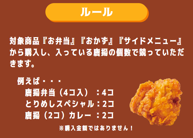 ● 対象商品:唐揚が入っている「お弁当」「おかず」「サイドメニュー」