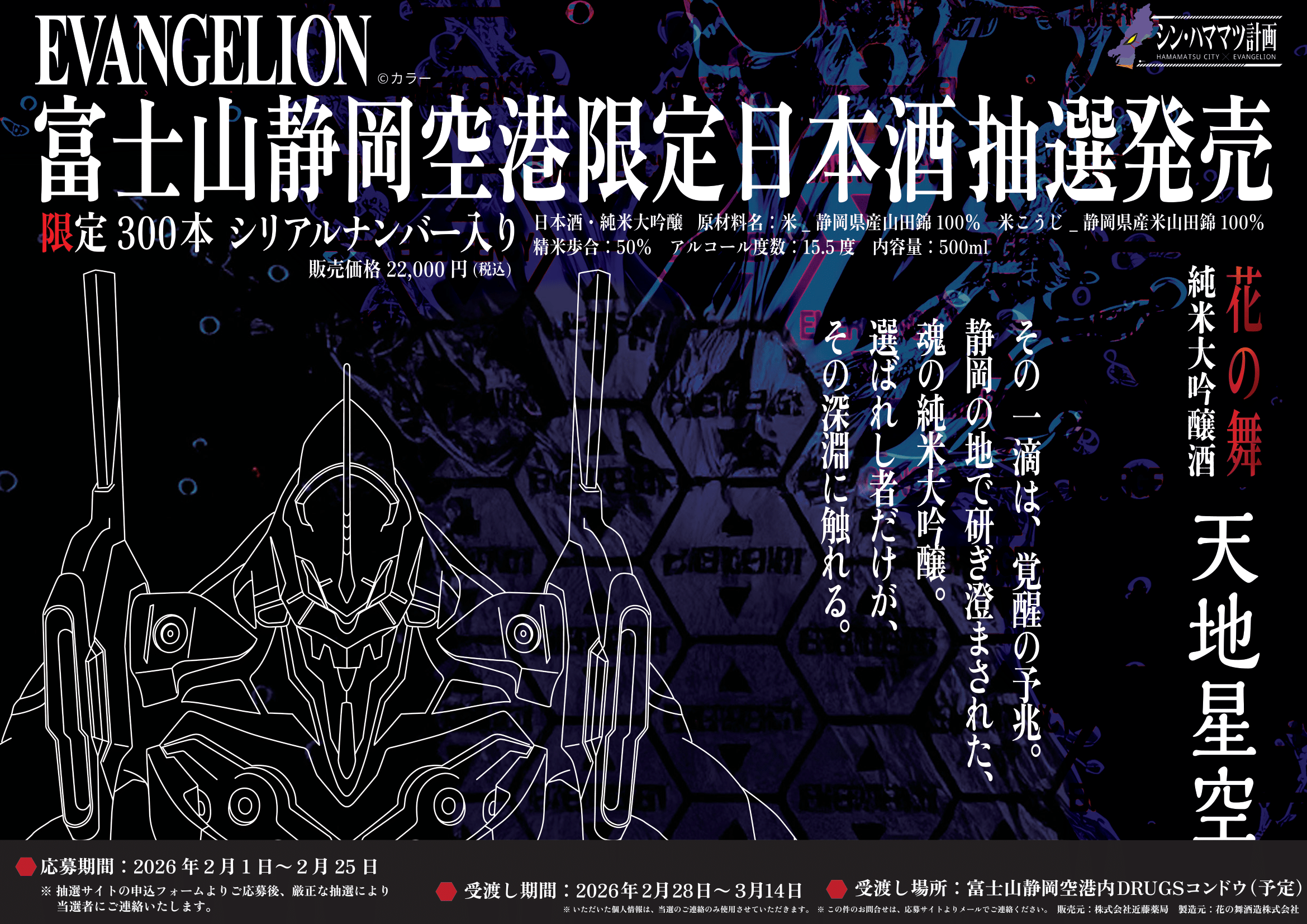 株式会社近藤薬局(本社:静岡県富士市)は、地域連携プロジェクト「シン・ハママツ計画2025」の展開に合わせ、富士山静岡空港限定企画として、『EVANGELION』と連携した純米大吟醸「天地星空」を抽選販売いたします。