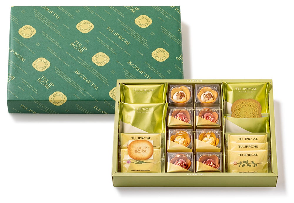 花の喜びをまるごと贈る詰合せ。代表作「チューリップローズ」3味に、ショコラがはみ出すチーズショコラサンド。花に香ばしく寄り添うグリーンピスタチオサブレも。華やかな5味を楽しめます。