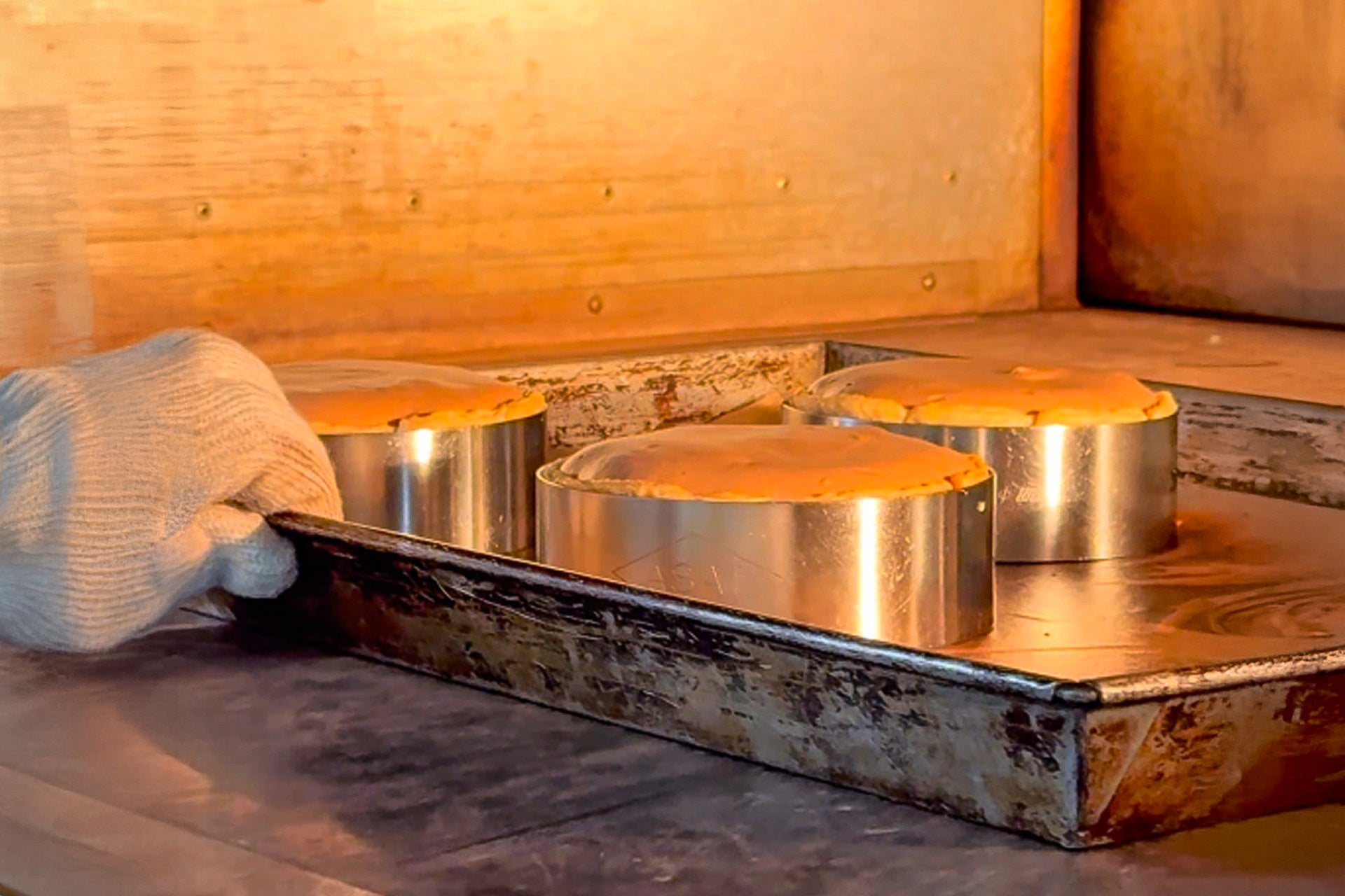 スフレのように湯煎でゆっくり焼く方法とは違い、このチーズタルトはガッと高温で短時間焼き上げるのがポイント。焼きすぎると生地に入った卵の影響で生地が固くなってしまうため、職人の経験と感覚が命を握る工程です。