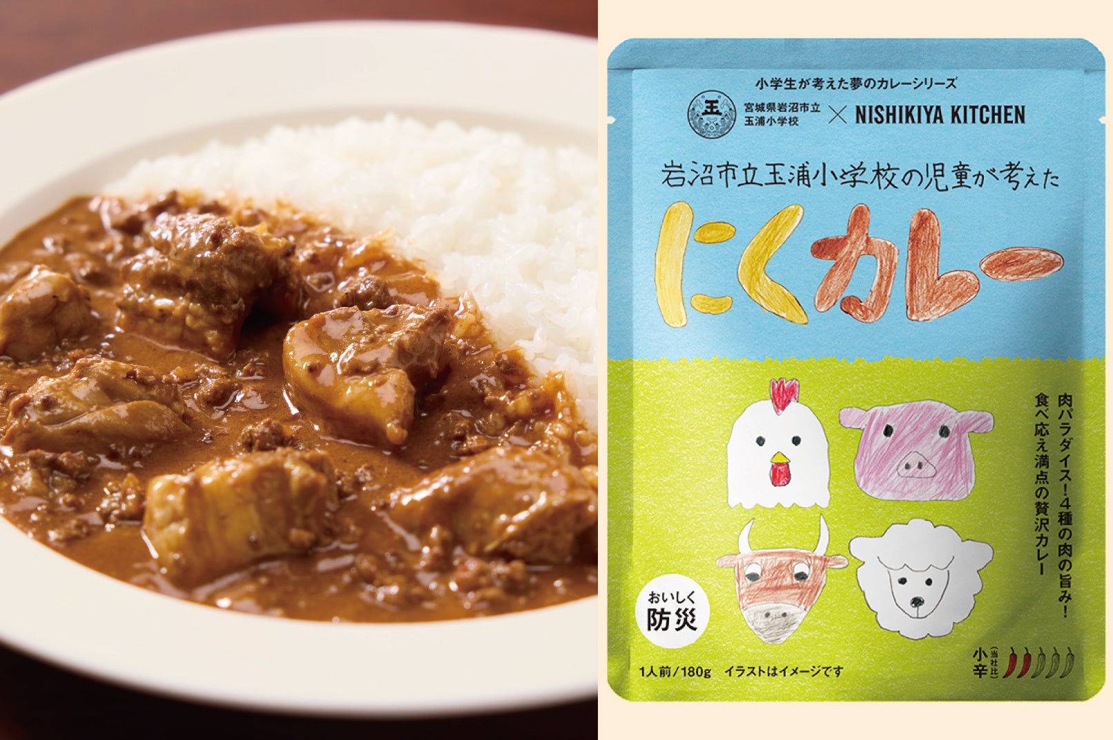「世界の料理を『カンタン』に。」をコンセプトに掲げ、レトルトカレーを中心に約120種類のレトルト食品を販売する専門店NISHIKIYA KITCHEN(ニシキヤキッチン)(株式会社にしき食品 本社:宮城県岩沼市、代表取締役社長:菊池洋一)は、東日本大震災から15年にあたり、宮城県岩沼市立玉浦小学校(以下、玉浦小)の児童と一緒に企画開発したレトルトカレー2品「りんごやきにくカレー」と「にくカレー」を2026年2月13日(金)から数量限定で販売します。本プロジェクト(=学校のカレープロジェクト)は、「子どもたちの夢をカタチにする体験を通じて、創造力を育み食育へつなげること」を目的として2023年よりスタートし、3年目となる今回は、初の地元である宮城県岩沼市の小学校と取り組みました。