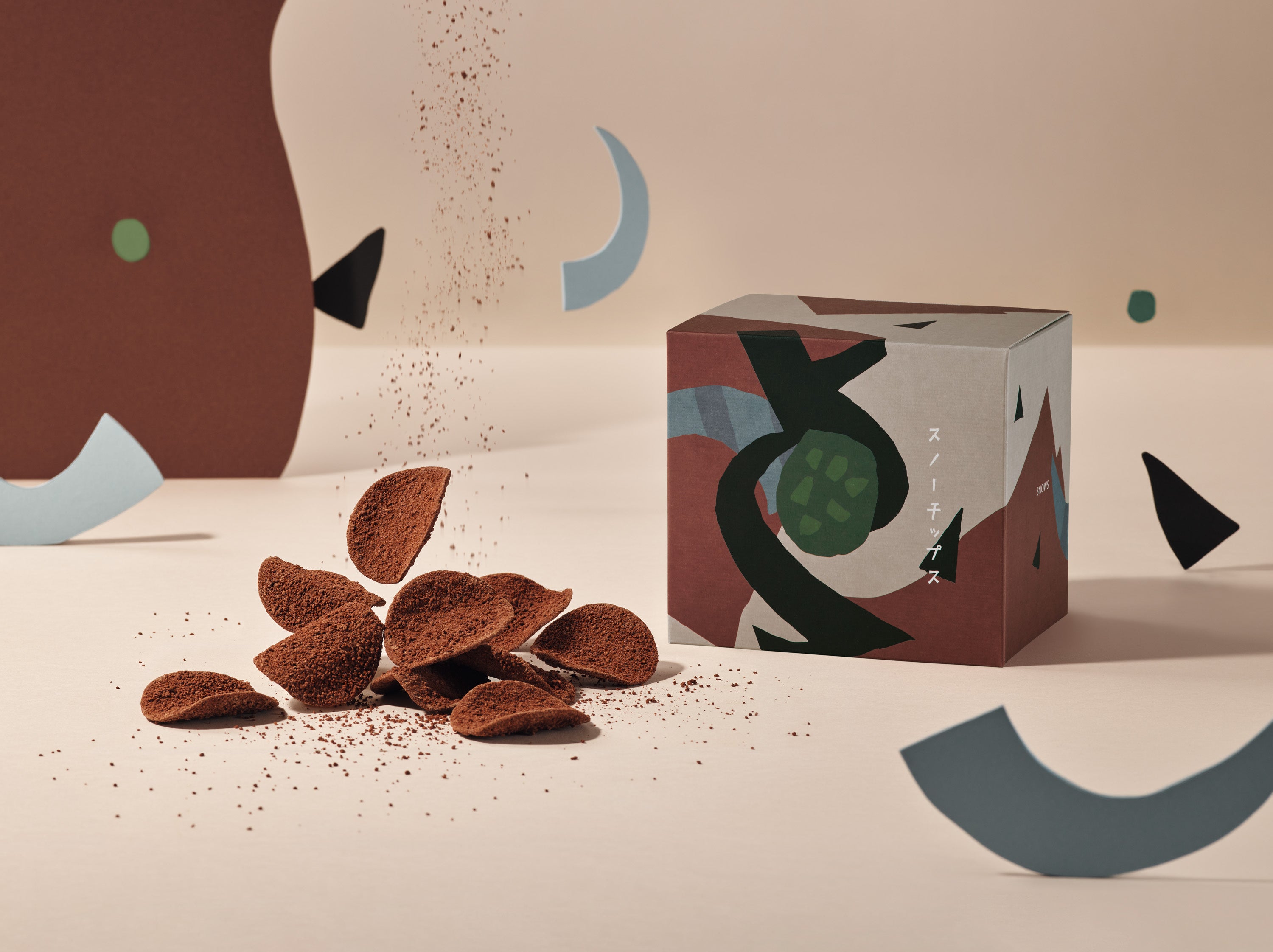 カカオの豊かな風味が広がる、一度食べたら忘れられない粉雪のような口どけのスノーチップス。①生地に練り込んだチョコレート、②チップスに噴霧したチョコレート、③最後に纏わせる粒状のチョコレートのトリプルチョコレートが生み出す絶妙な美味しさを体感ください。チョコレートをたっぷり練り込んだ生地は極限まで薄くし、独自の揚げ焼き製法で作り上げるサクッとした食感が特徴です。おいしさにこだわり、手間と時間をかけて製造しています。