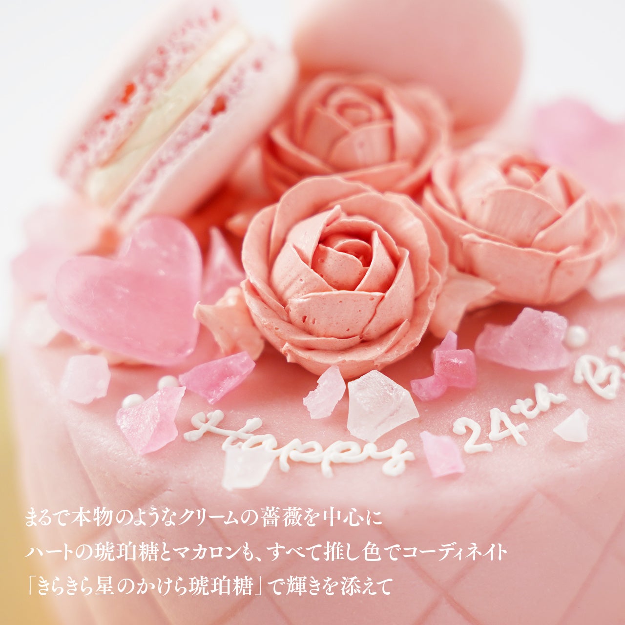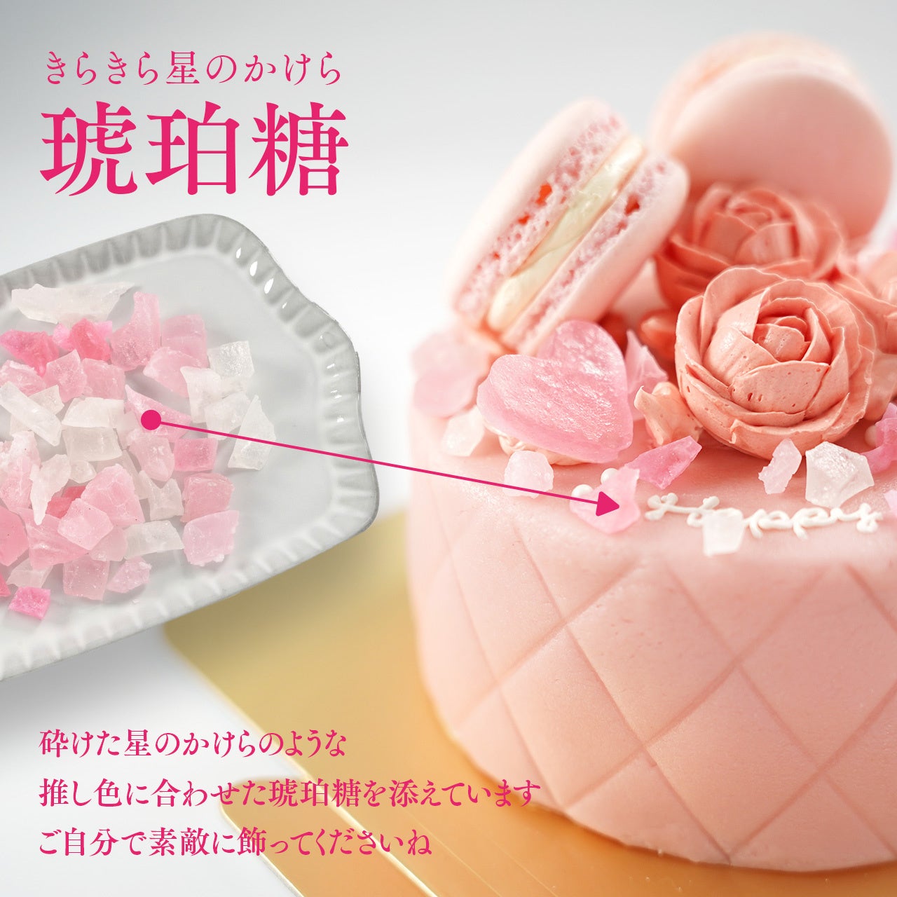 さらに、それぞれの推し色に合わせた「きらきら星のかけら琥珀糖」がついていますので、メッセージや薔薇の周りなどに自由に散りばめ、あなただけの宝石箱ケーキを完成させてください。