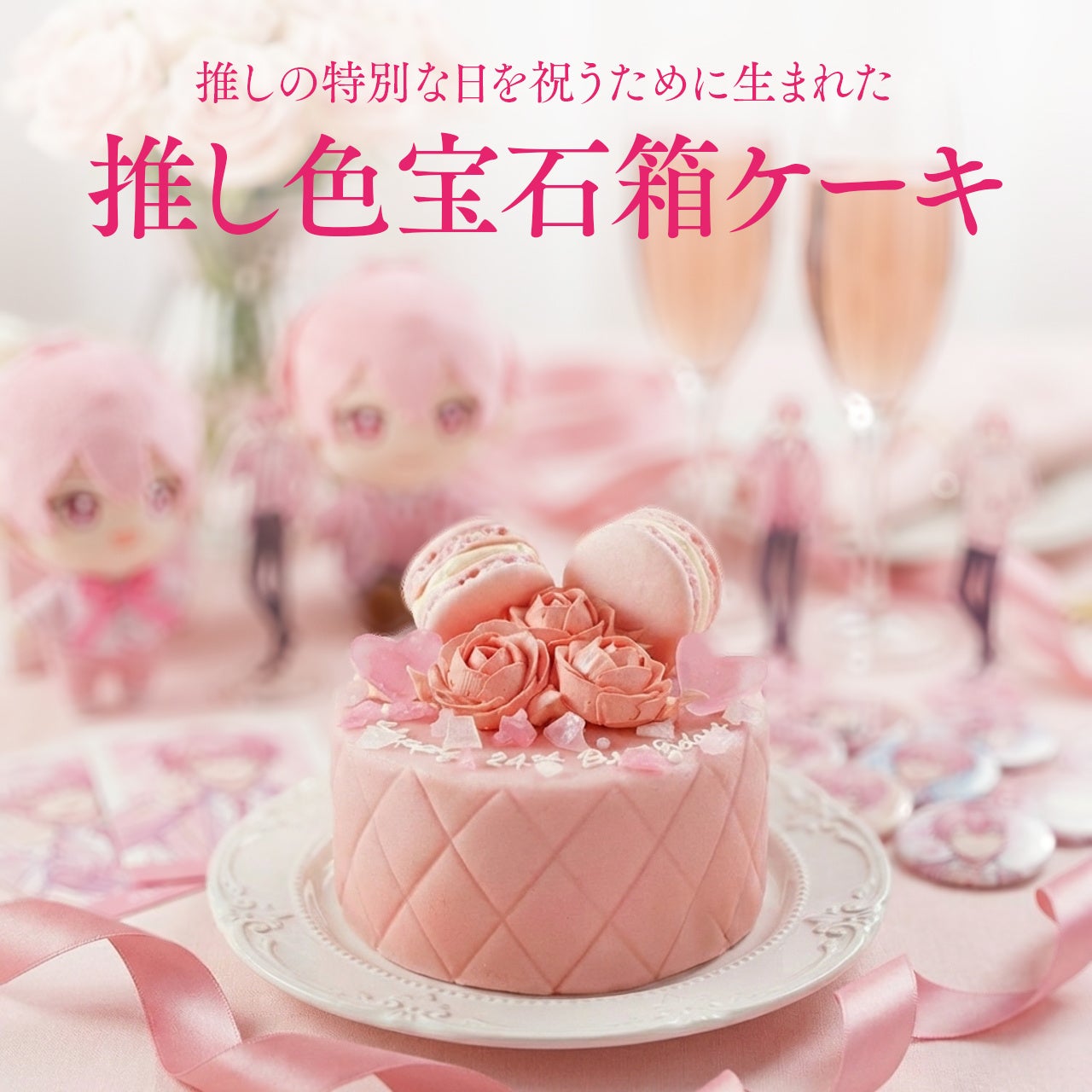 推しの名前やメッセージを20文字まで自由に指定し、ケーキ全体の色味を11色から選べるので、世界でただひとつのケーキになります。イベントや誕生日のお祝いにもぴったりで、推し色でコーディネイトしたテーブルをかわいく彩ります。