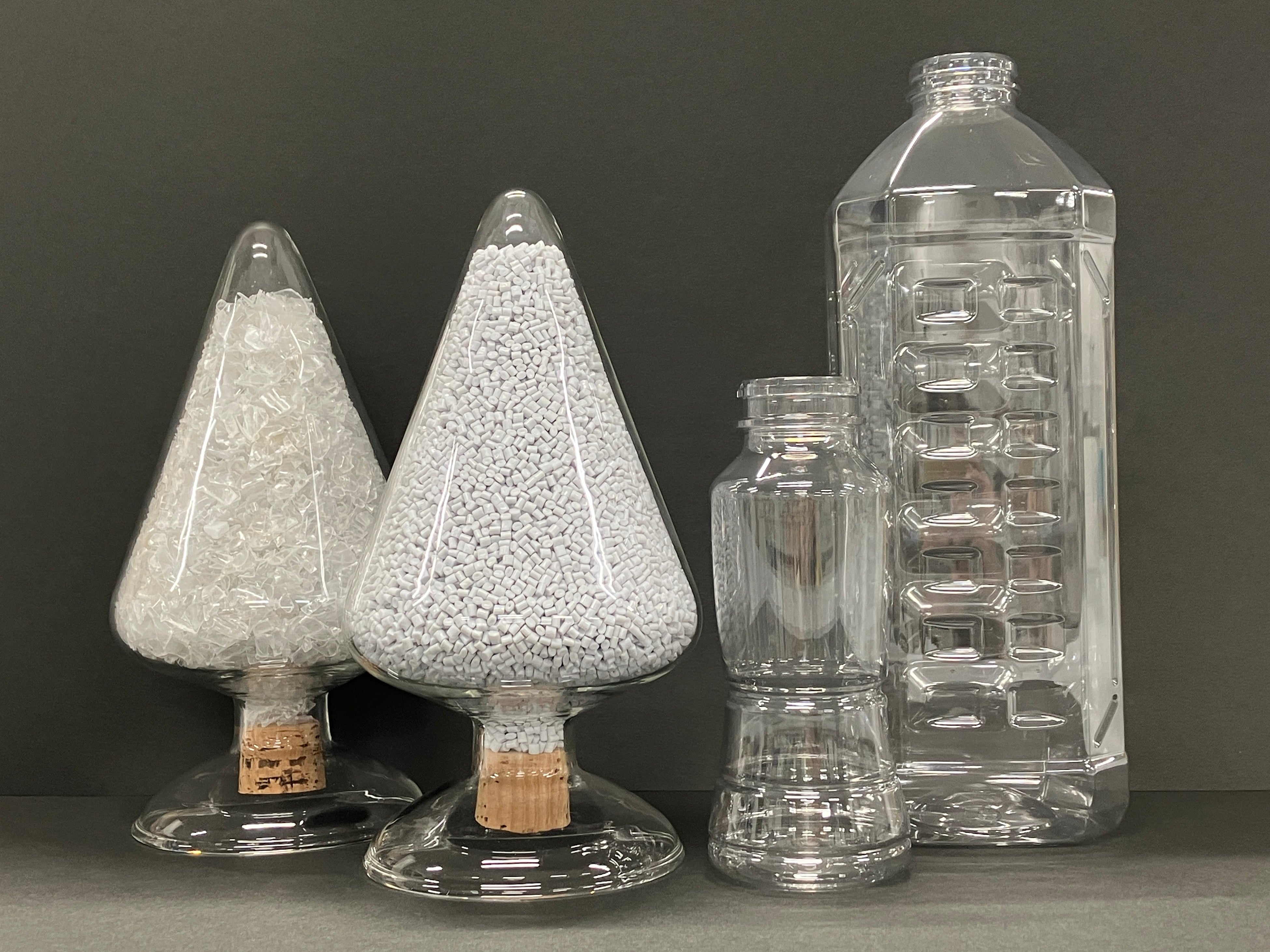 実機テストにより得られた洗浄フレークと再生レジン、および試作した再生PETボトルに