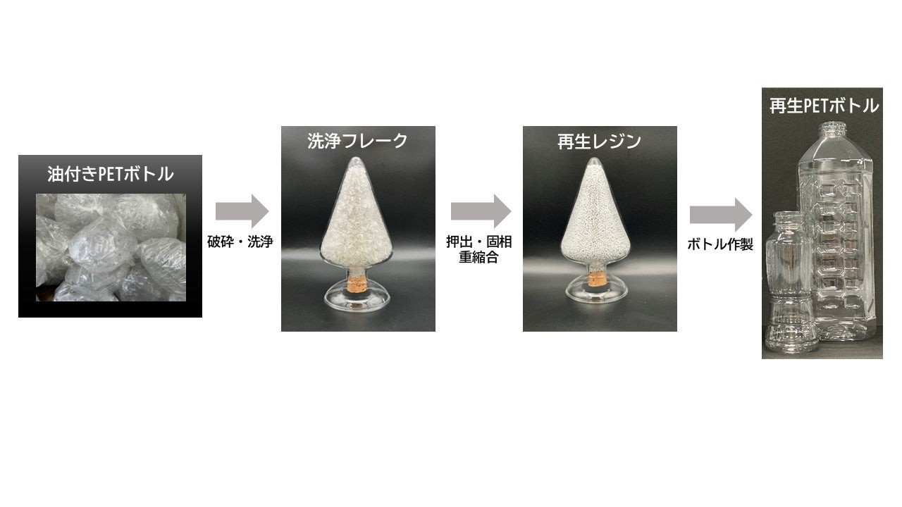 飲料や酒類、しょうゆなどのPETボトル(指定PETボトル※2)は、使用後に回収・洗浄され再生材料となり、PETボトルへ戻す水平リサイクルが進んでいます。一方、食用油やドレッシングなどの油付きPETボトルは、付着した油を再生工程で充分に取り除くことができず、再生PETボトルの品質に、におい移りや着色などの悪影響を与えることが懸念されていました。そのため、使用後は主に燃やしてエネルギー源として活用されており、食品用のボトルとしてのリサイクルはされていません。これらをリサイクル原料として利用可能にし、循環型社会の実現に貢献するため、油付きPETボトルを使った実機でのリサイクル試験と再生PETボトルの評価を実施しました。