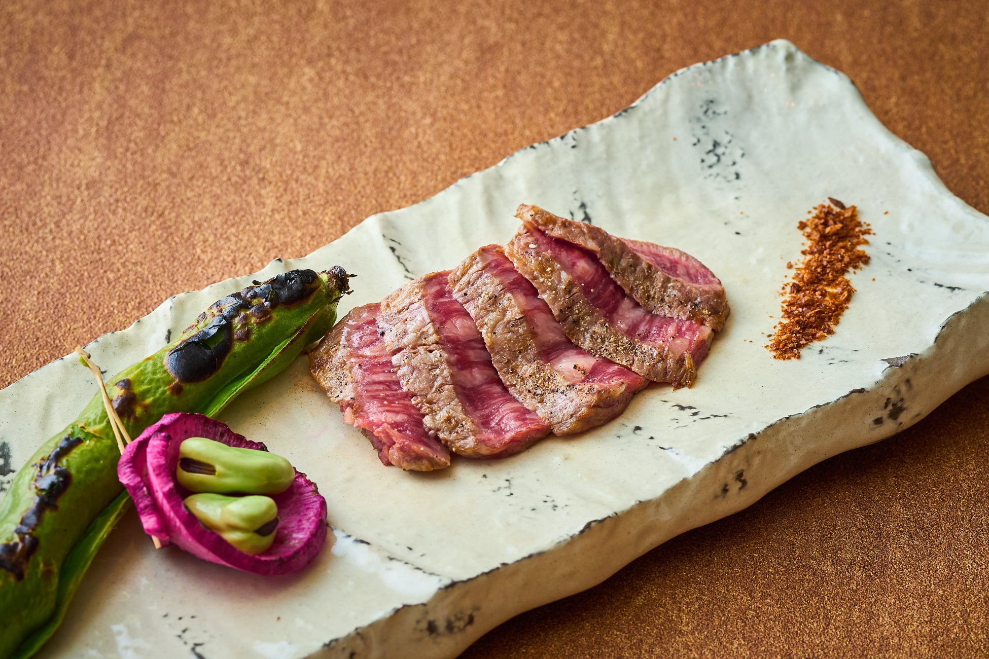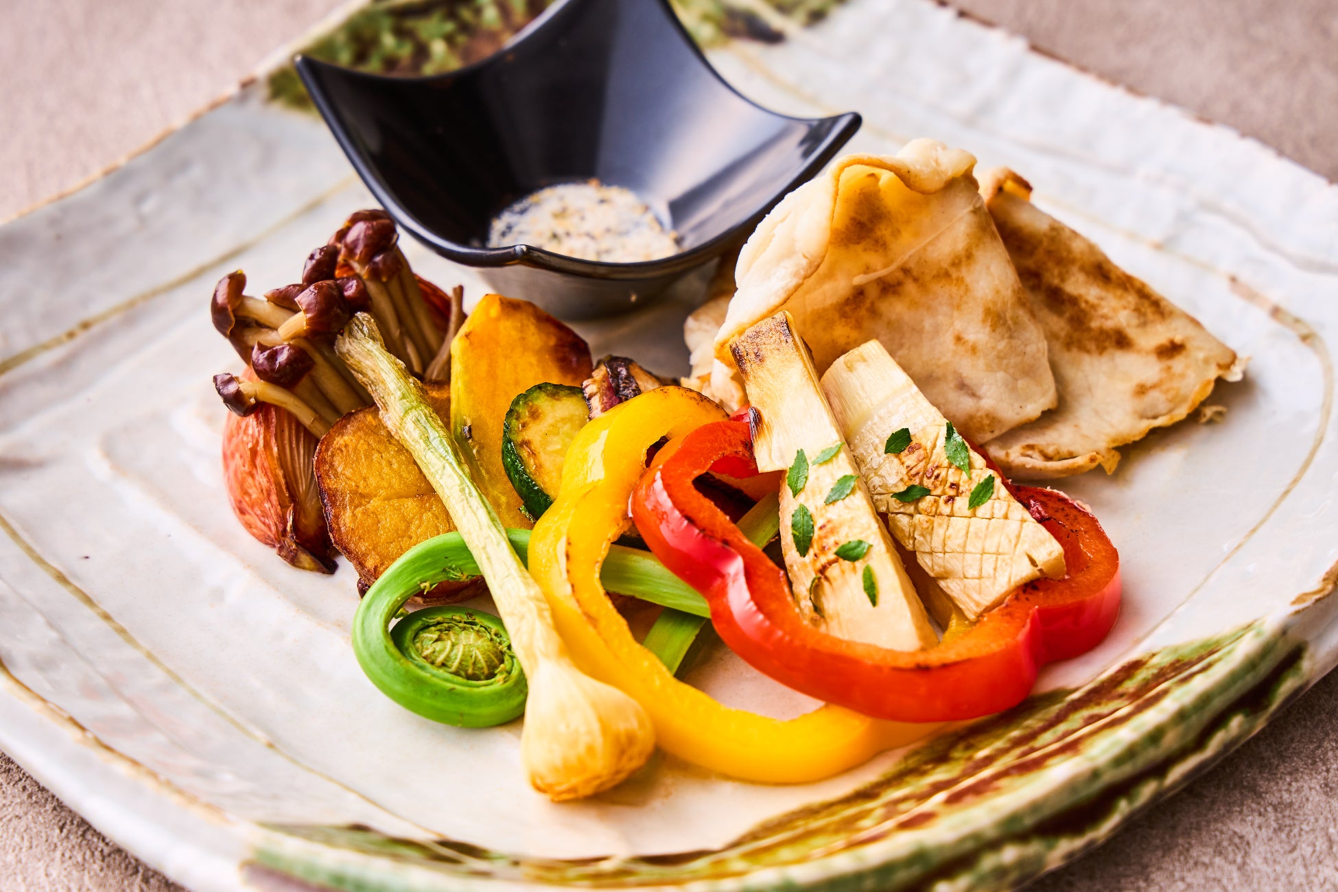 四季彩ランチは、メイン料理を旬香自慢の鉄板焼き、炭火焼きなどで調理した6種類からお選びいただけます。中でも『月替わりの炭火焼き(¥3,400)』では、毎月異なる旬の彩り野菜を楽しむことができます。3月はシャキシャキとした食感で歯ごたえの良い「春筍」を、炭火で香ばしく焼いて香りを引き立てます。さらに、脂身の質が良く旨みとコクがあり、舌触り滑らかな「山形豚」を炭火でさっと焼いて調理する“焼きしゃぶ”を一緒にご提供いたします。付け合わせの野菜やきのこも、本来の味を楽しめるようシンプルに昆布塩でお召し上がりください。