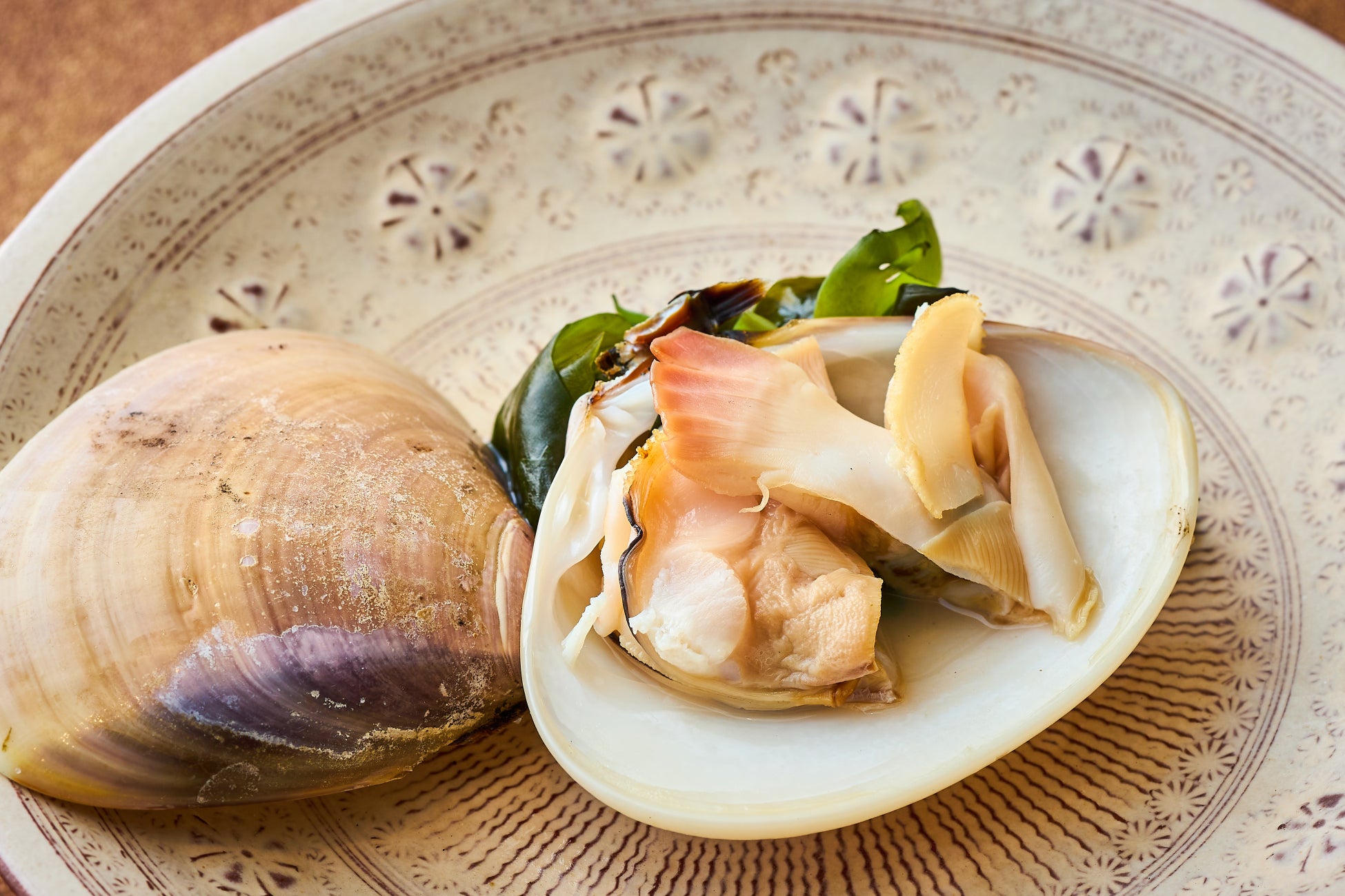 桜鯛の薄造りと帆立貝の酒盗ソース |