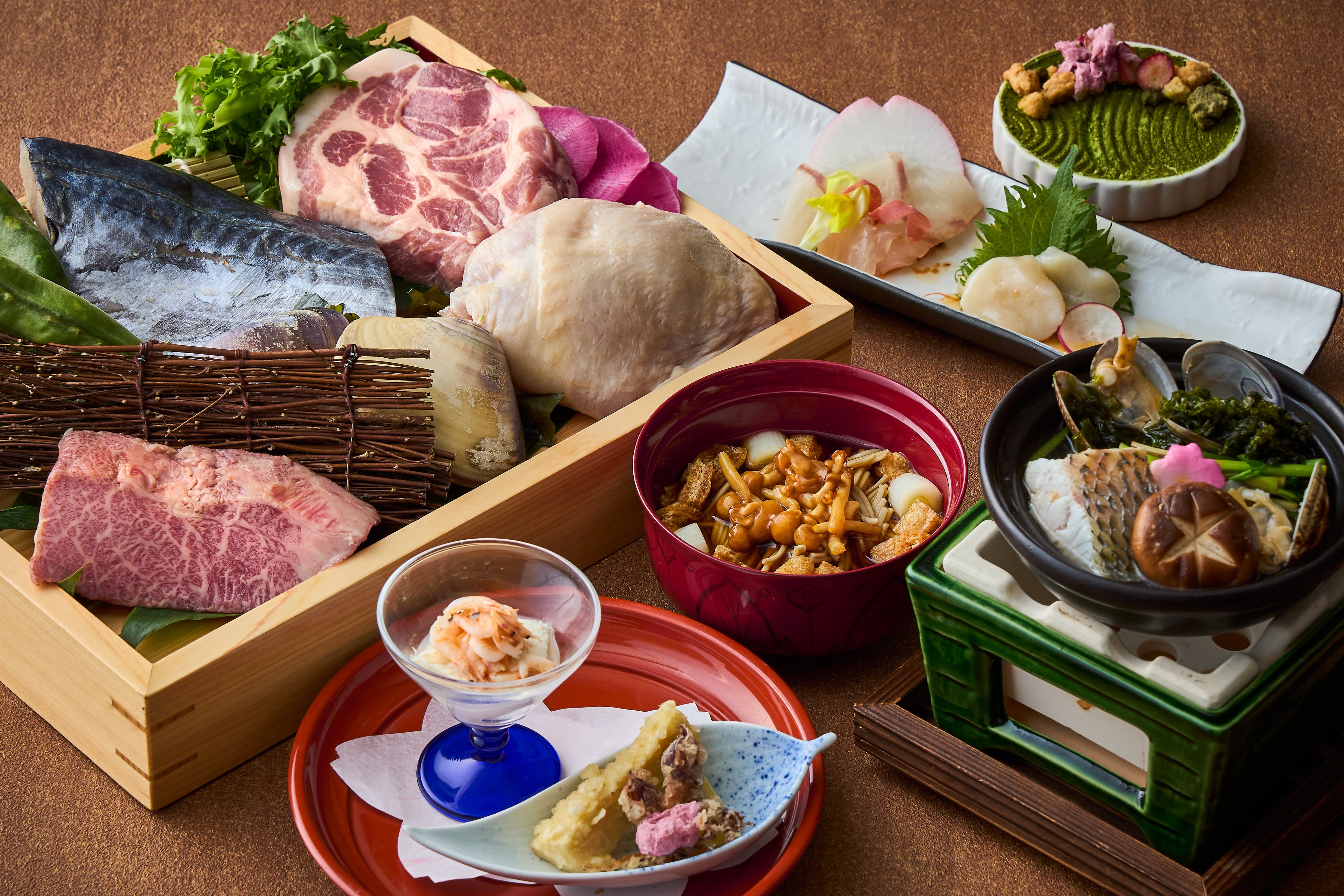 メイン料理を数種類の食材の中からお選びいただける「四季彩コース」は、旬の食材の美味しさを料理長ならではの調理法でお楽しみいただけます。前菜では、ごま油の芳醇な香りで味付けした桜海老を乗せた手造り豆腐と、旬のほたるいかと筍の天麩羅をご用意。造り替りは、お祝いの席にも適した縁起の良い桜鯛の薄造りと、帆立貝を酒盗のソースで和風カルパッチョ風に仕上げたお酒によく合う一品です。小鍋はヘダイとあさりの旨みをあっさりとしたあご出汁で引き出し、あおさの磯の香りが優しく広がる春らしい鍋に仕上げました。